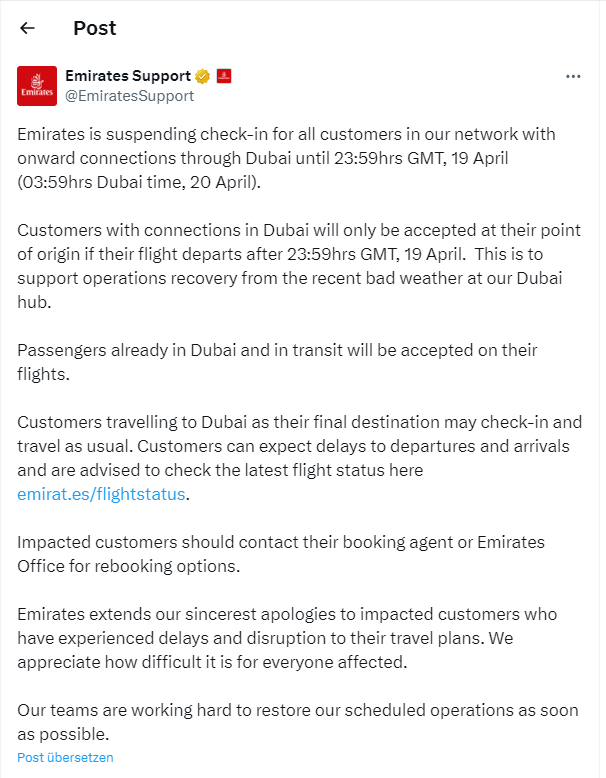 Wenn ich mir die Bilder in Dubai sehe, dann war das eine Jahrhundert-Flut und wäre schon sehr froh dem zu entkommen und nach Hause zu kommen. Emirate/DBX haben sogar Transit Trafic gestoppt, dass Transit-Passagiere nicht mal einchecken durften.