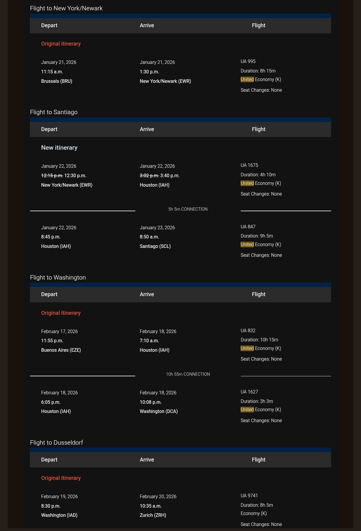 Wenn es keine Multi-Stopp-Buchung wäre, dann würde hier einfach nur “Flight to Santiago” von Beginn an stehen, mit zwei Umstiegen in EWR und IAH.