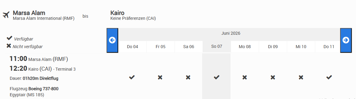 Nun kann ich die Verbindung leider nirgendwo finden, da das Leg RMF-CAI (MS185) nicht auftaucht. Laut Flugplan gibt es diese am 04.06.: