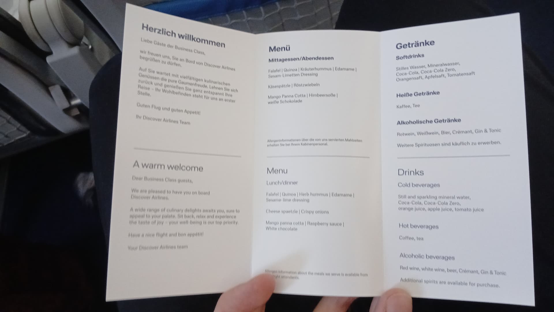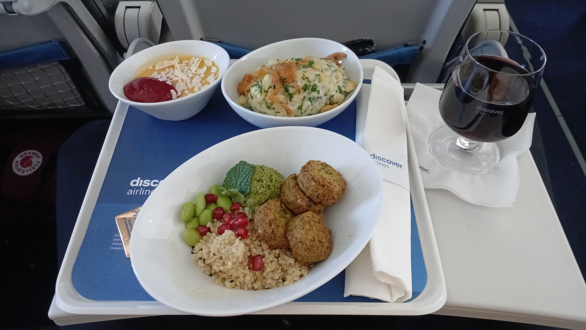 Hier die Bilder von meinem Letzten Disco Flug nach Palma im 01/26. Würd ich ehrlich gesagt kein Geld für ausgeben. Das Spätzle war warm und wirklich lecker, aber eben nur in kleiner Menge. Diese Quinoa und Falafel Dinger habe ich probiert und wieder zurück gegeben. Keine Ahnung wer sowas Essen kann. Der Wein ist lecker und in Mengen vorhanden.