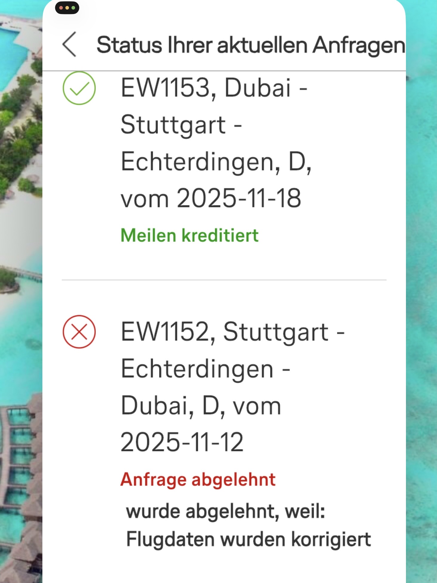 Status: „Anfrage abgelehnt weil Flugdaten wurden korrigiert“