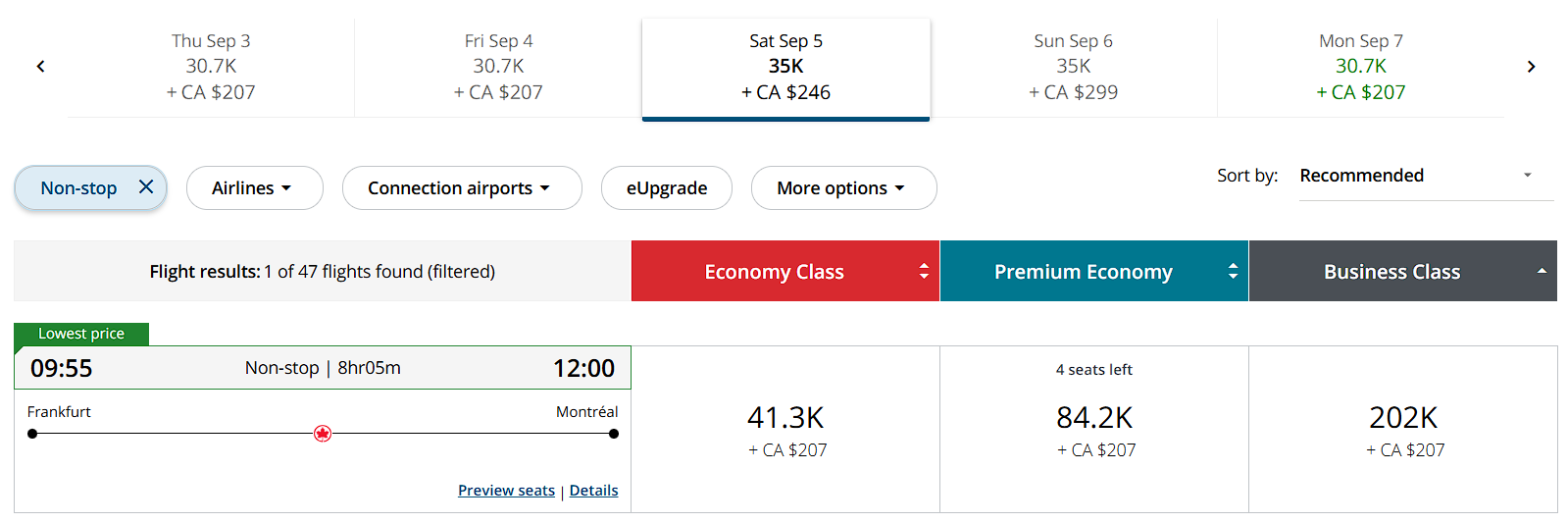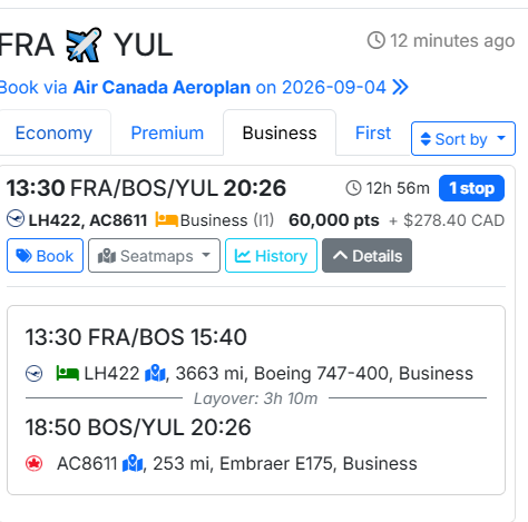 Sicher? Ich finde bei Aeroplan eigentlich für jeden der Tage Nonstop-Verbindungen für FRA-YUL und FRA-YYZ mit AC: