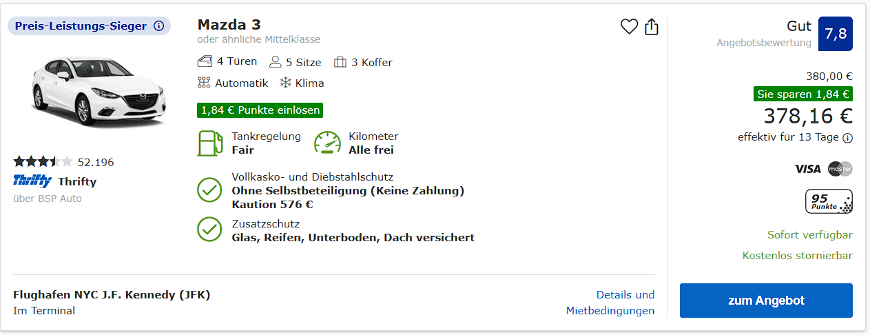 Die Autovermietung Preise im JFK sind etwas höher als in YUL oder YYZ. Wir möchten sehr gerne wieder ein schönes/ grosses SUV. Und die sind vergleichbar mit Canada etwas Teurer. Wir buchen gerne immer über ADAC.