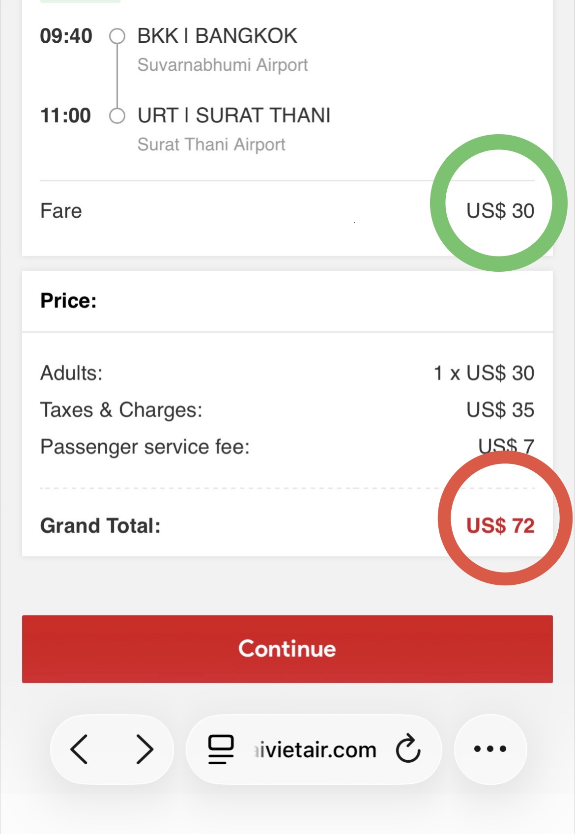 Gegen Check bei Airline ThaiVietJet 30 USD wurden angezeigt ABER nach dem Click wurden zusätzliche die S&G addiert und damit 72 USD ![]()