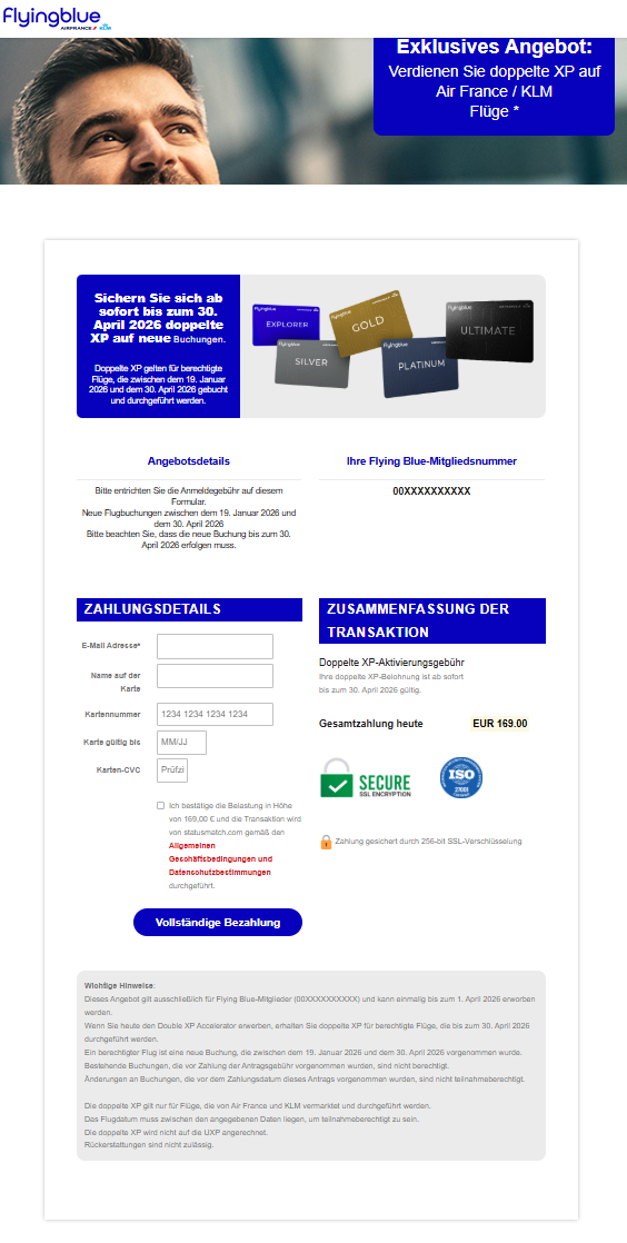 Wie ich finde, jedenfalls ein sehr verlockendes Angebot, da alle XPs (also die Statuspunkte bei FB) nach Aktivierung (offenbar bis 19.02. möglich) für alle Buchungen auf AF/KL bis 01.04. für eine Einmalzahlung von 169€ (zumindest bei mir, falls der Betrag nicht auch personalisiert ist) verdoppelt werden.
