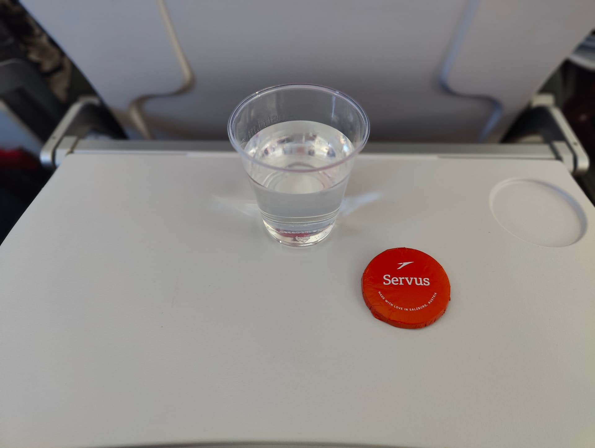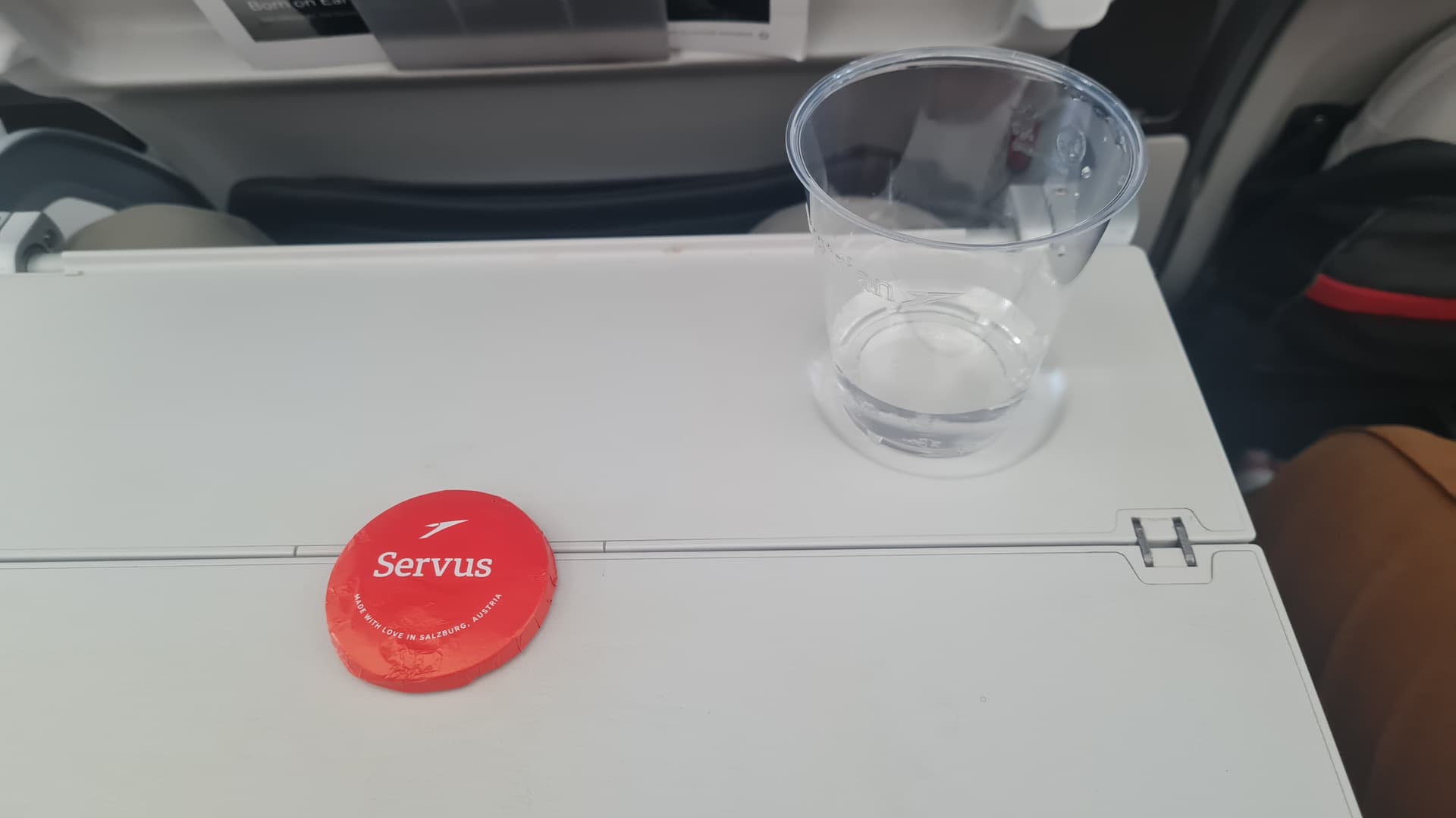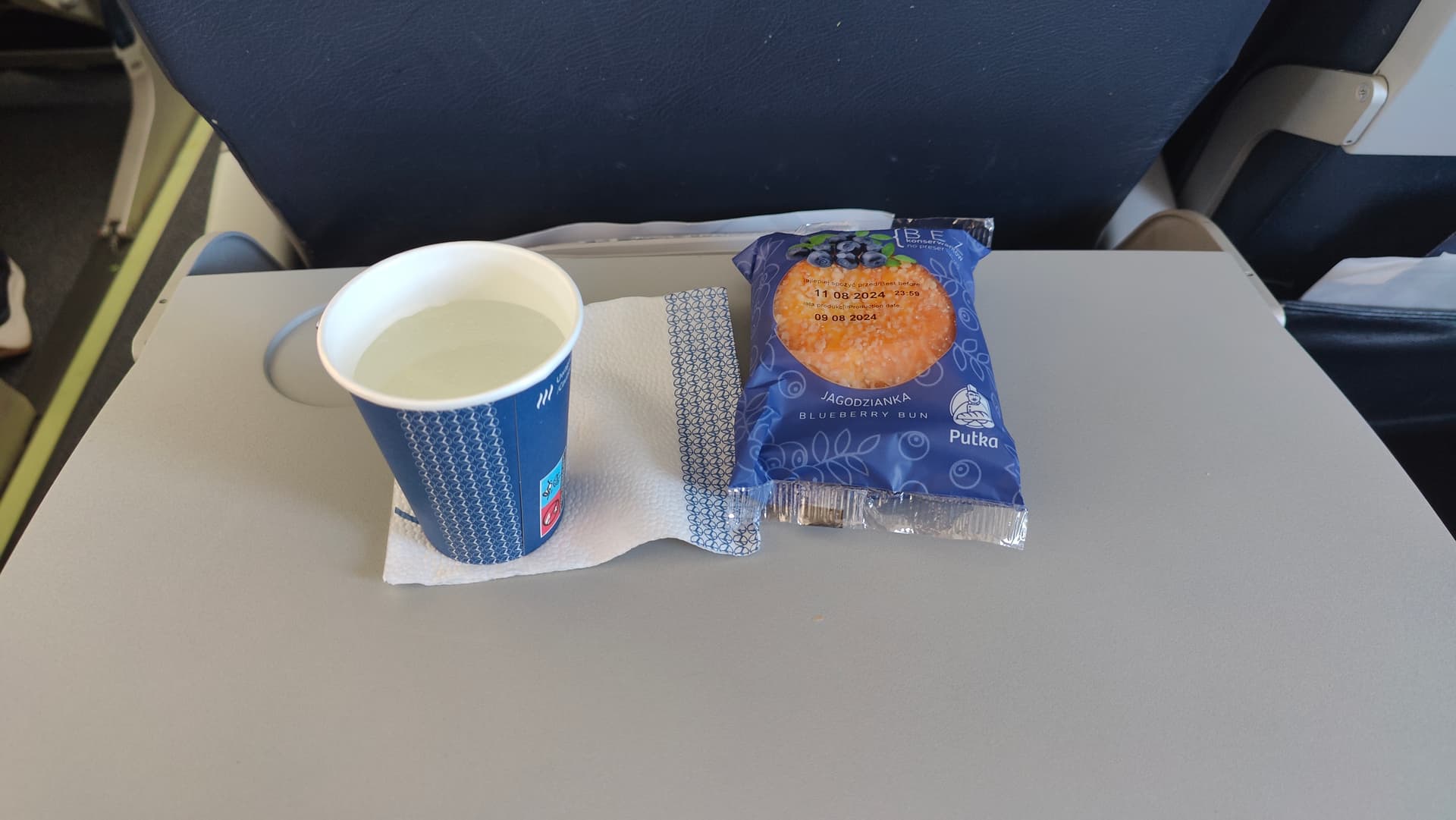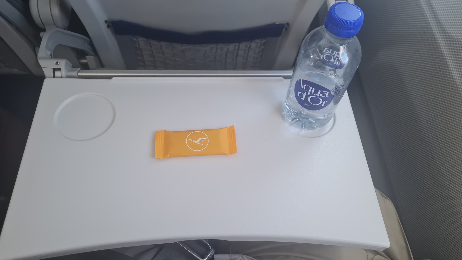 Es gab Wasser und ein mit Marmelade gefülltes Gebäckstück sowie bei Eintritt ein Handdesinfektionstuch.