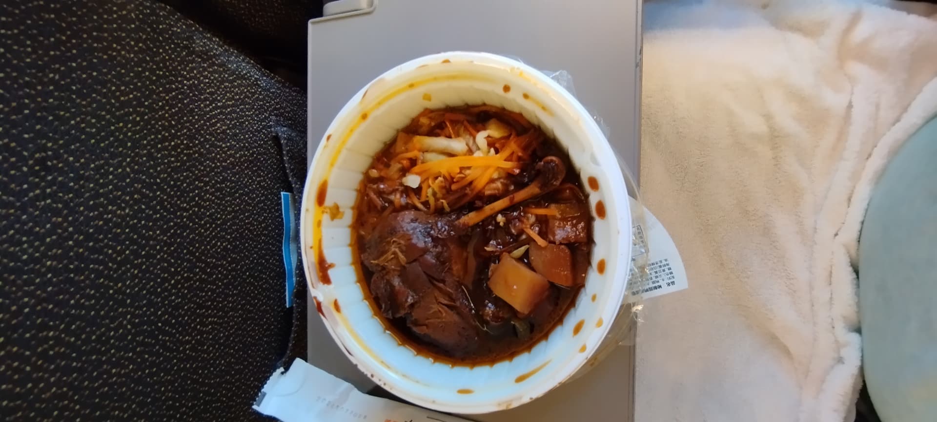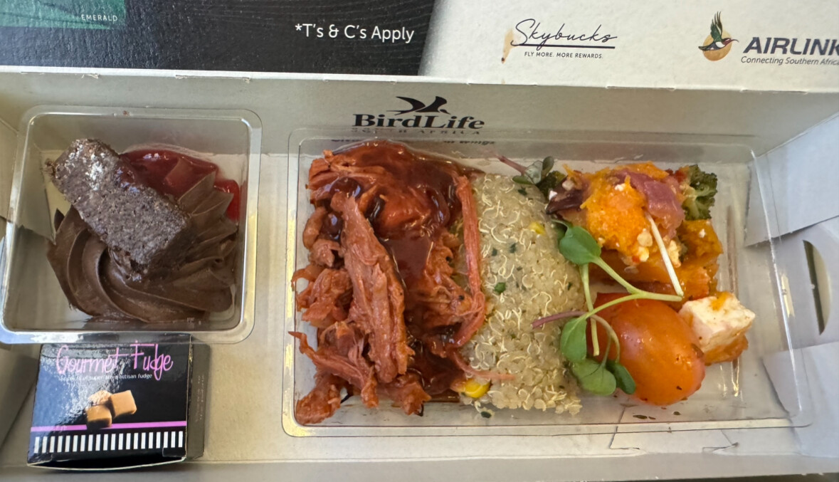 Kaltes Pulled Beef - mit echten Kräutern und Couscous - alles wieder extrem lecker, sodass ich nicht verstehen kann, warum sich europäische Airlines mit Airline Essen so schwer tun. Desert mit Fudge und Schoko-Creme habe ich nicht gebraucht - das war wie die Riesen Schüsseln von DoCo bei BA&Co.