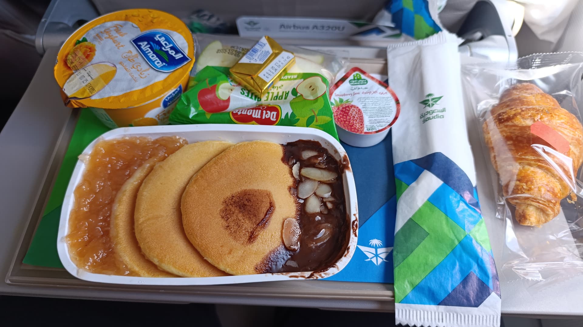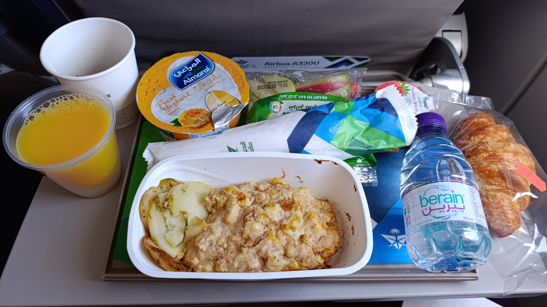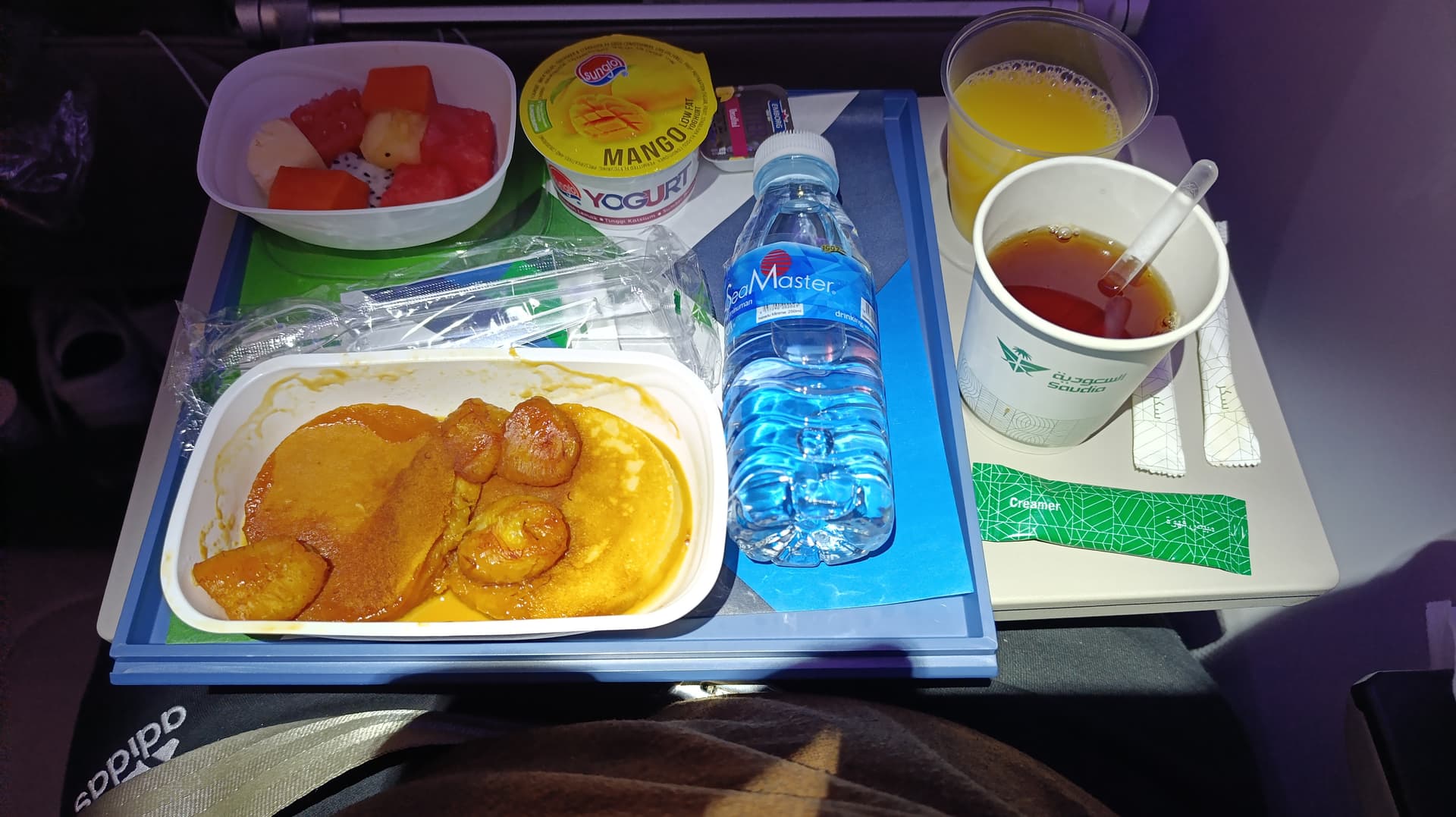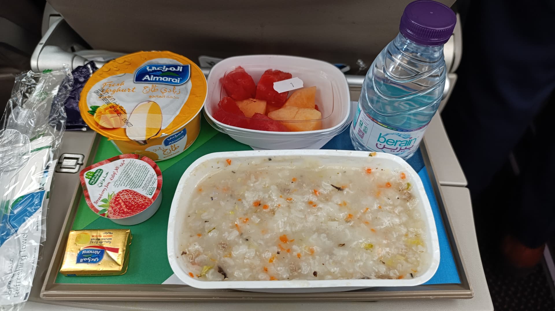 Abflug war gegen 2:00 Uhr in der Nacht, dennoch gab es nich dinner service. Geschmacklich gut, ganz im Gegensatz zum „porridge“ was es zum Frühstück gab. Das war wirklich ungenießbar und auch optisch fragwürdig. Alternative war pancakes, manchen anderen Pax wurde noch etwas anderes angeboten, so ganz verstanden habe ich das Konzept nicht.