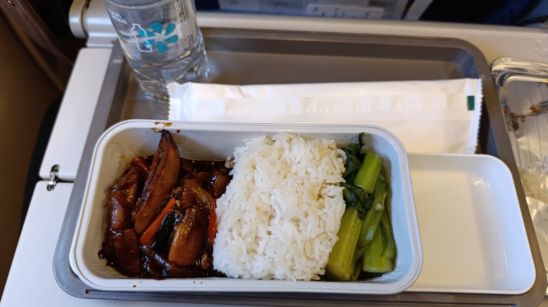 angeblich sei der C Gast nicht erschienen, sagte man mir. Und da die Maschine sowieso nicht voll besetzt gewesen war und ich wohl der einzige SEN gewesen sein muss zu Gast, fragte mich der Purser ob ich nicht das Essen aus der C haben möchte. Nun ja, wer würde dieses Angebot schon ablehnen wenn man es bekommt ![]()