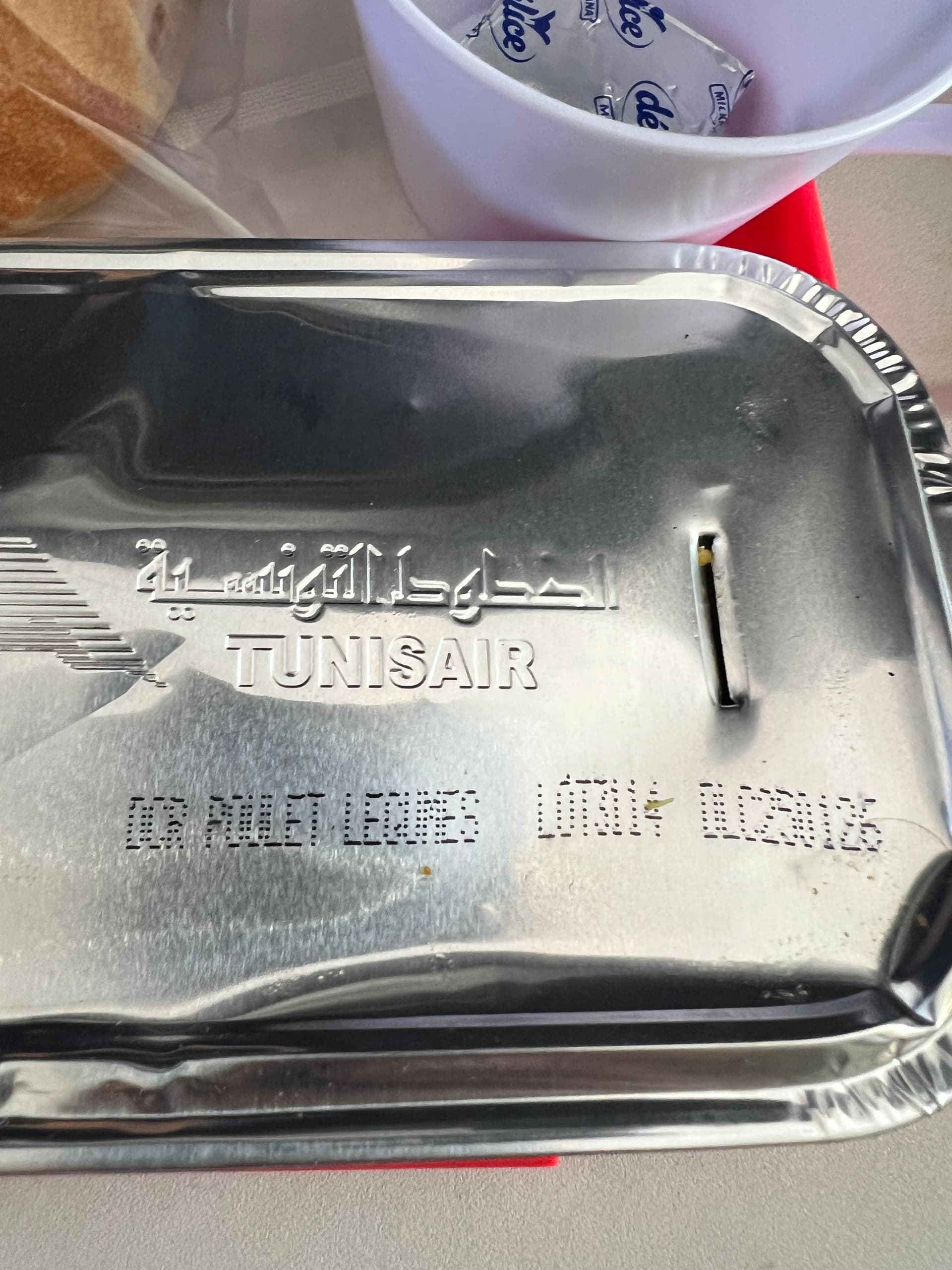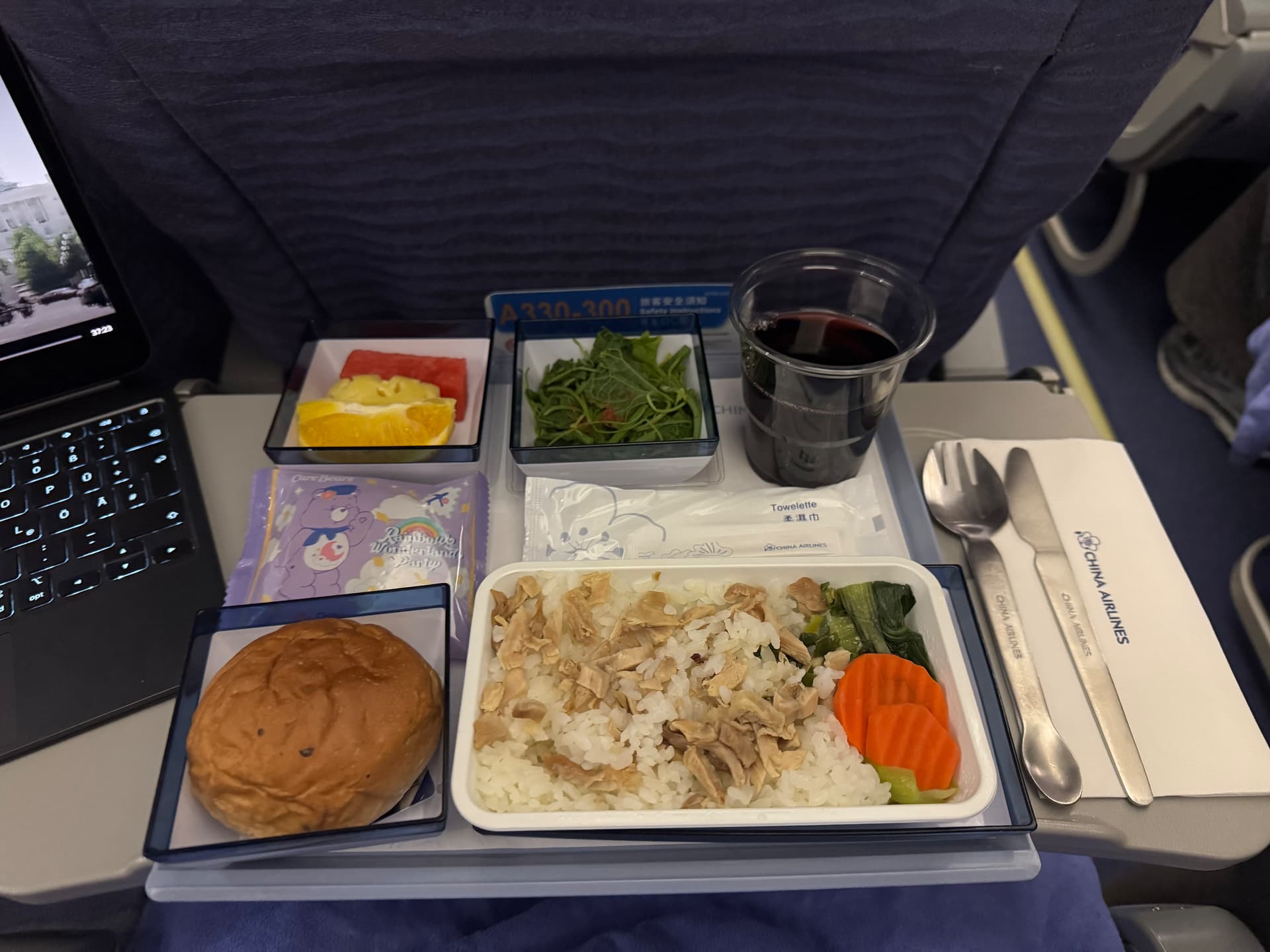 ) als Bordservice (darunter die China Daily auf Englisch!). Bordservice war dann Wasser sowie der weltweit kleinste Saft (100 ml Tetrapak!?) mit Knoblauch-Chicken mit Kartoffel auf Reis sowie einem Seegurken (???)-Salat. Beides sehr essbar…