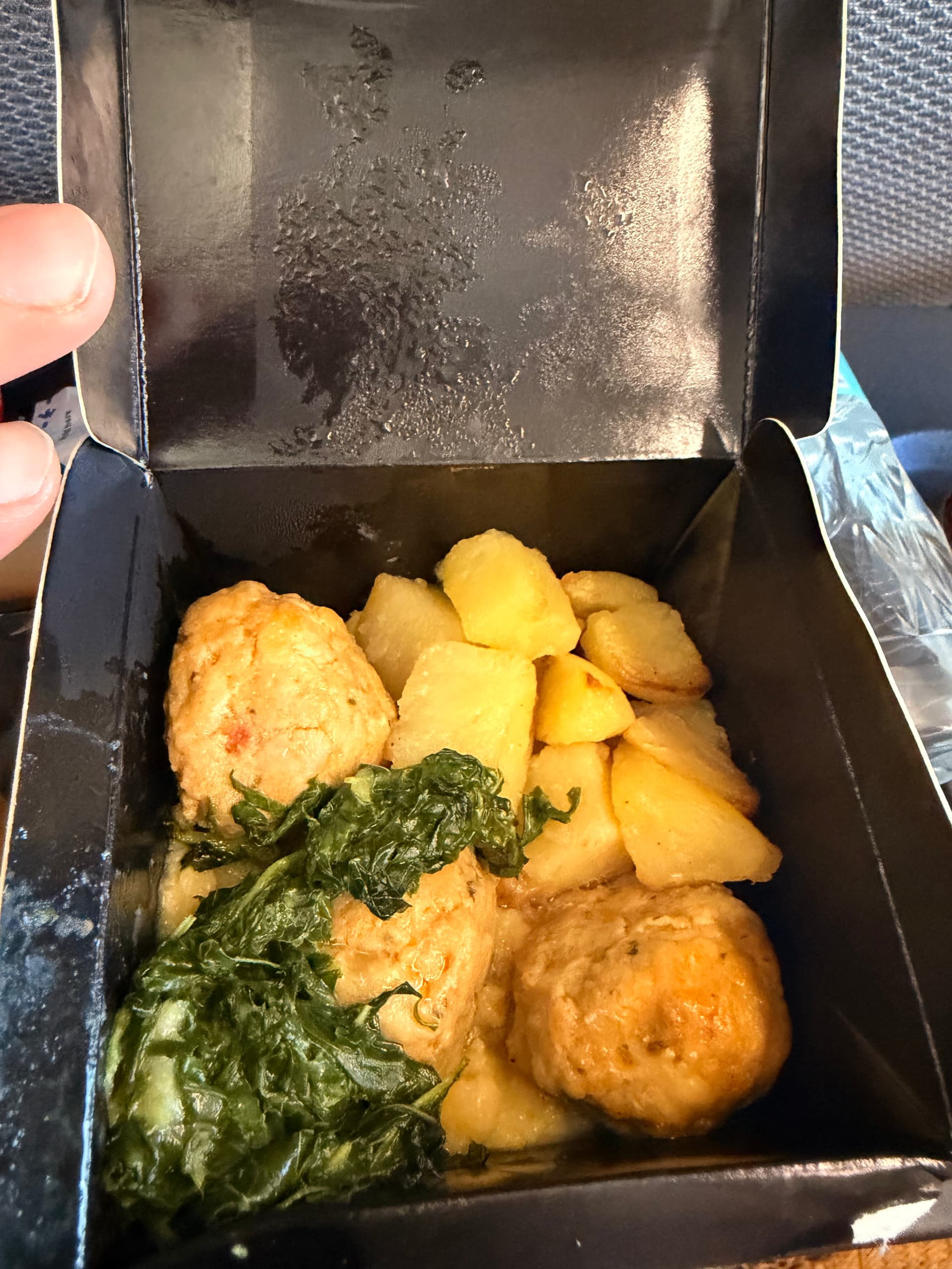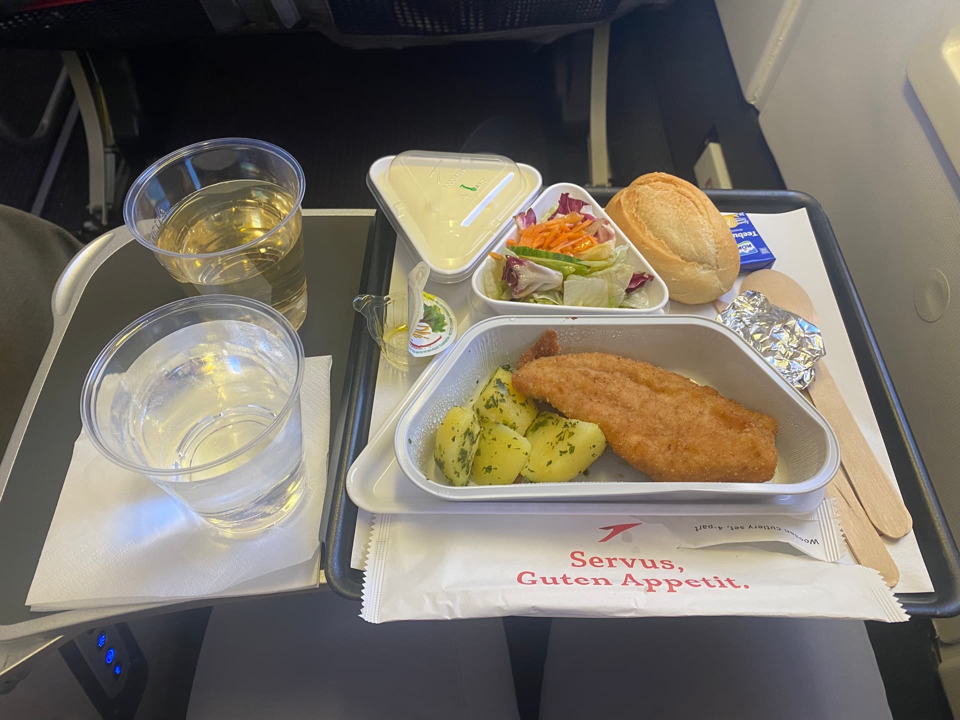 Hähnchenschnitzel (gar nicht mal so trocken) mit Kartoffeln (eher trocken). Dazu einen Weißwein und Wasser. Das Holz-Besteck war furchtbar. Beim Abräumen wurden nochmal kalte und heiße Getränke angeboten.