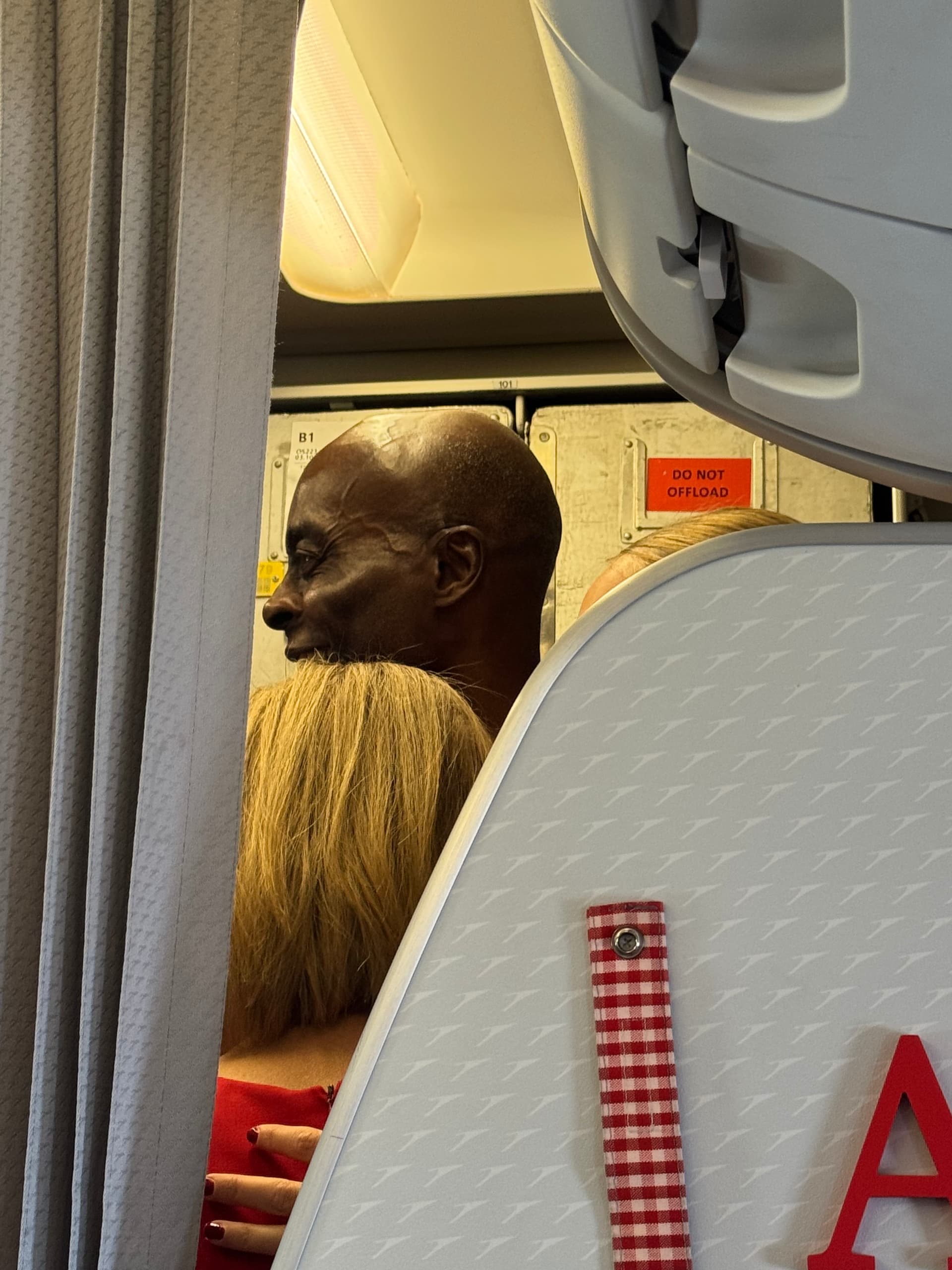 Ansonsten wichtigstes Tagesereignis bisher: Bruce Darnell war unser Sitznachbar im Flieger. Und die gesamte Crew inklusive Pilot (ich hoffe, es war am Ende nur irgendwer im Cockpit!? ) wollte mit ihm Fotos. War aber süß - und sie haben vorher extra nochmals eine Ehrenrunde durch die Kabine gedreht, bevor es zur Fotosession kam.