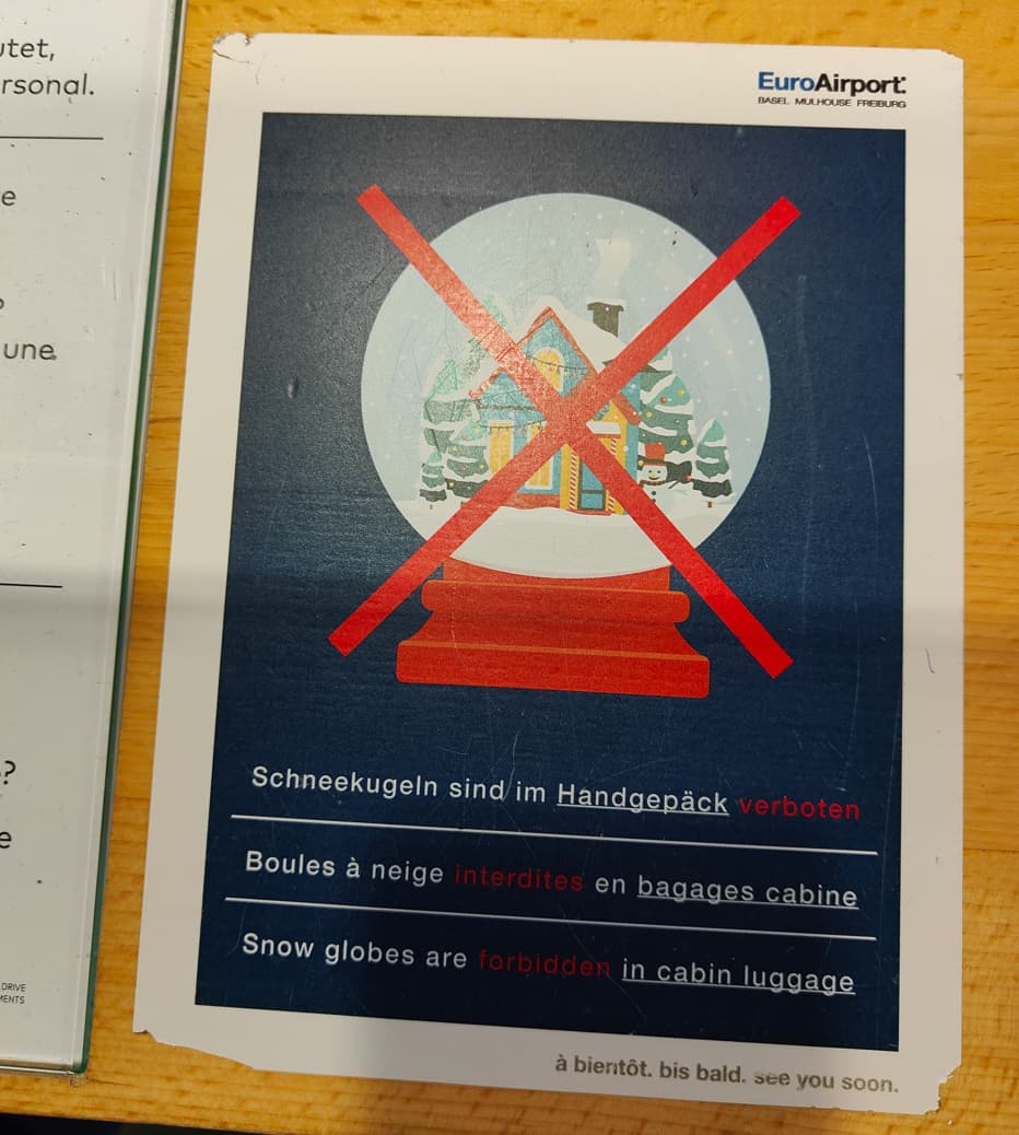 Uns wurde erklärt, dies sei wegen all den Amerikaner, welche Schneekugeln im Dreiländereck kaufen und denken, sie könnten diese im Handgepäck mitnehmen.