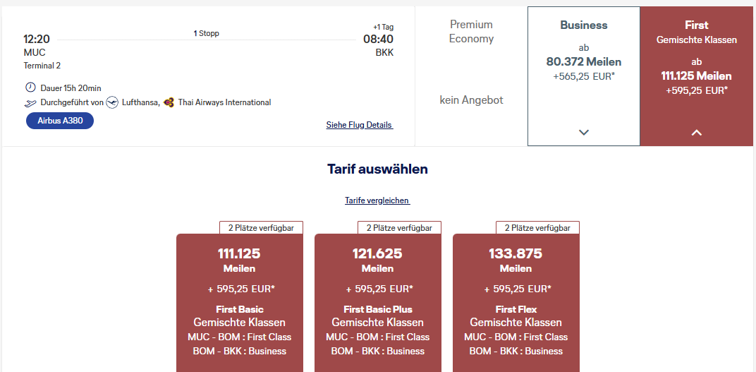 Info für alle, die nicht nach Thailand sondern Indien wollen: LH First nach Indien (DEL und BOM) ist im Herbst übrigens an vielen Tagen verfügbar. Jedenfalls one-way… Return finde ich paradoxerweise wenig bis gar nichts.