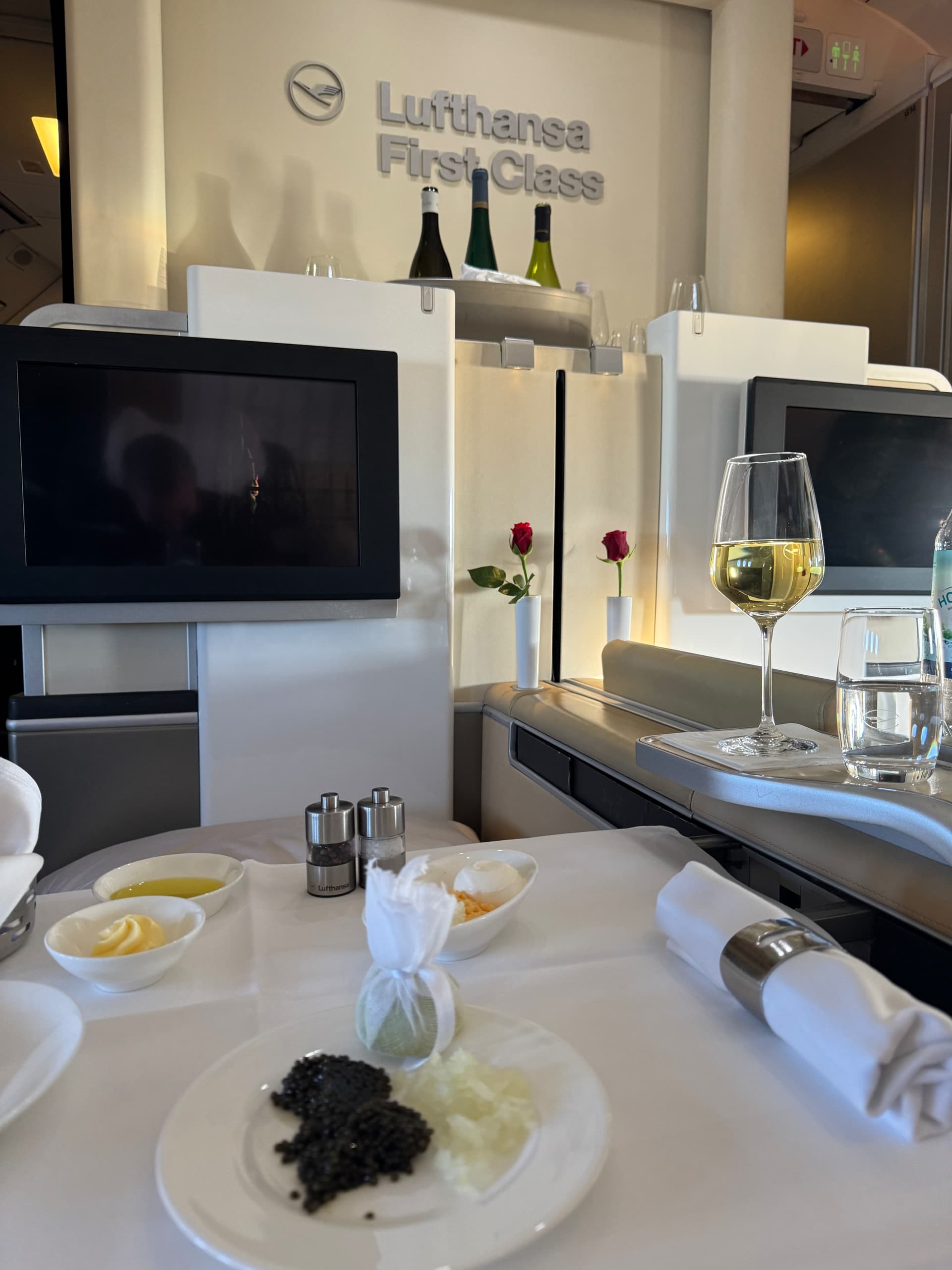 Das Boarding aus dem Terminal ist dann großes Kino mit der eigenen Passkontrolle und den privaten Boarding-Schaltern. Unser LH Assistant war auch großartig; witzig, flapsig, zuvorkommend. Die Fahrt übers Rollfeld… Der private Zustieg in den Flieger - unbezahlbar! Wir haben auf diesem Flug nie andere als unsere 6 Mitreisenden der First gesehen neben dem Personal. Surreal! Auch Top: mein Vater flog separat an, durfte aber mit ins First Terminal und trotz Eco-Sitzplatz gab es für ihn noch den Aperitif an Bord in der First, bevor er auf seinen Platz „durfte“… (am nächsten Morgen hat er noch eine Tasse Tee bei uns getrunken!)