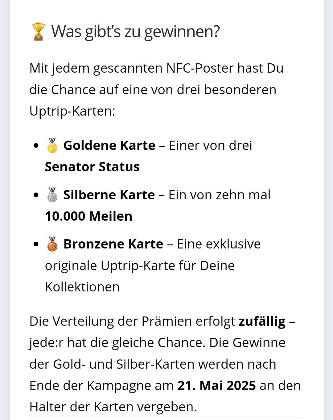 Aber steht doch da auch: „mit jedem gescannten NFC Poster hast du die Chance auf eine von drei besonderen Uptrip Karten“.