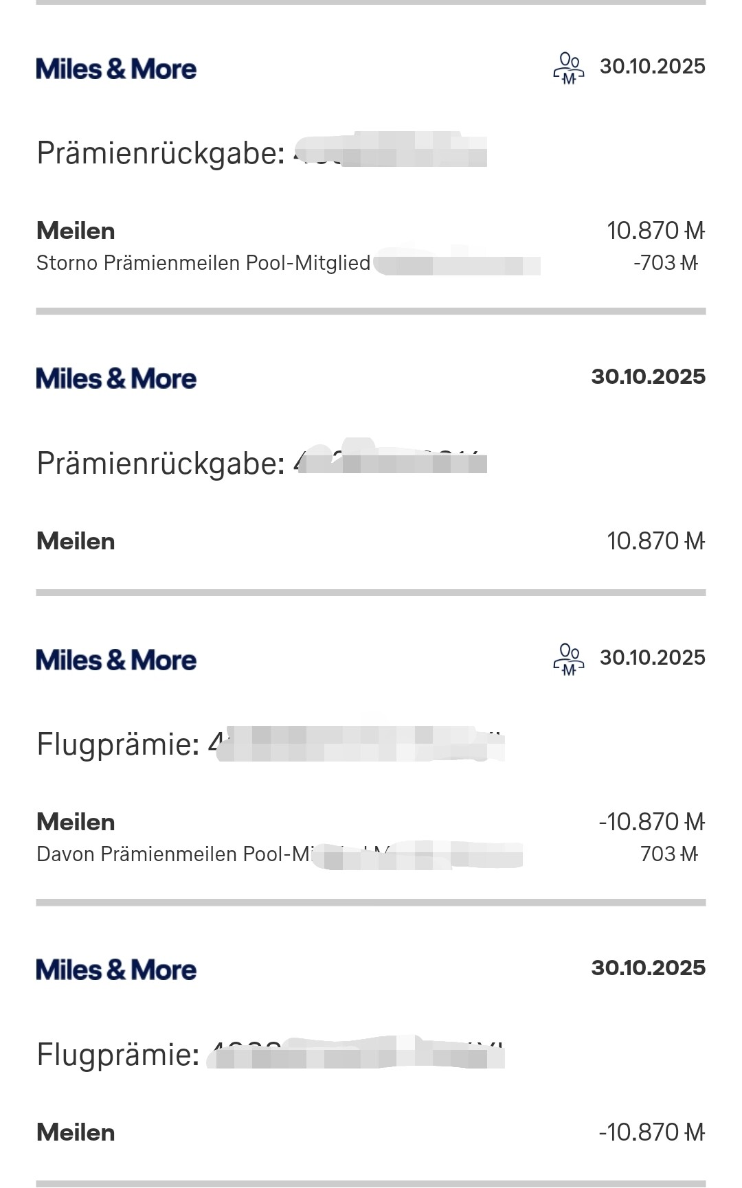 ich habe gestern Abend (nachdem ich für über eine Stunde die Fehlermeldung “Das bereitgestellte Vielfliegerprofil ist falsch” bekam) drei Business Saver Prämientickets gebucht. Kurz darauf wurden die Meilen für zwei Tickets wieder erstattet (Prämienrückgabe). Die Buchung wird aber weiterhin sowohl bei M&M als auch in der LH App als bestätigt für alle drei Passagiere angezeigt. Hatte sowas schon Mal jemand? Natürlich beschwere ich mich nicht über eine Meilenerstattung, es kann sich hier ja aber nur um einen Fehler handeln, der hoffentlich nicht in einer stornierten Buchung resultiert, die wir erst am Flughafen bemerken.