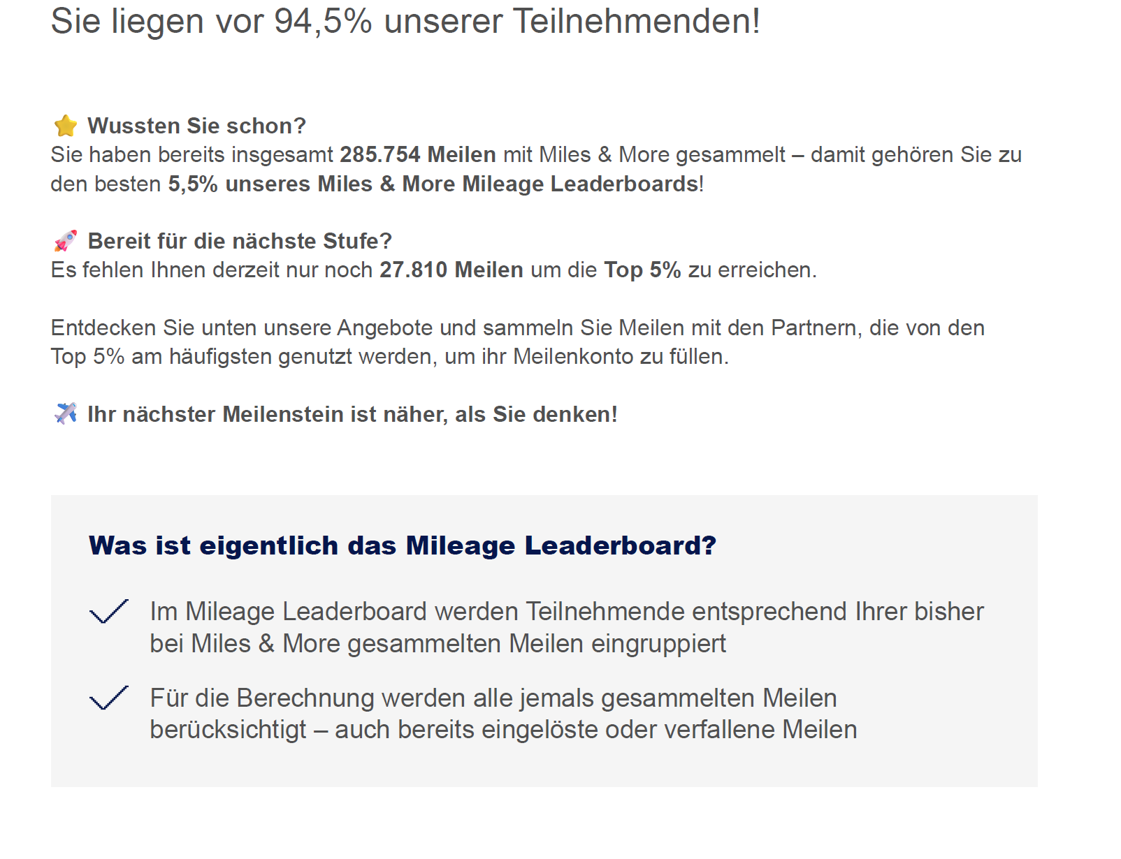 So oder so, ist ein Marketing Gag und man möchte Dich anspornen, noch mehr „wertvolle“ Meilen zu sammeln…Damit Du endlich zu den Top 5% gehörst, was Du Dir sicher schon immer gewünscht hast