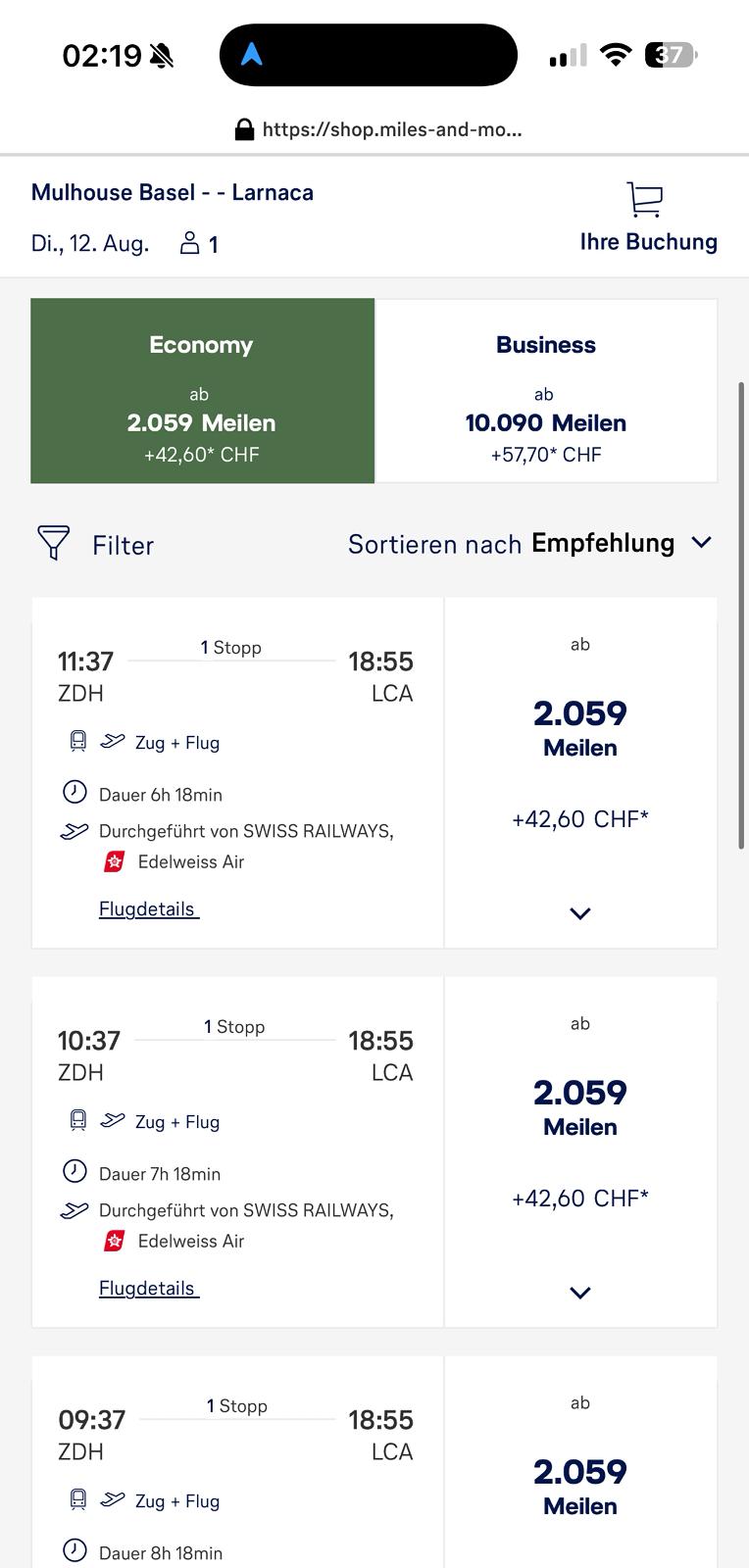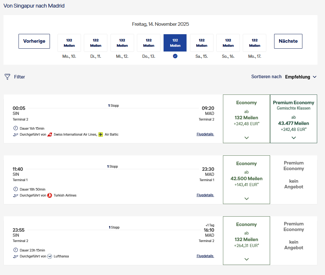 Für die Schweizer (und angrenzende Deutschen und Franzosen): Es gibt in vielen Fällen günstigere Prämienflüge, wenn man als Abflugort „ZDH“ also Basel SBB eingibt. Konnte durch dies viele Deals holen.