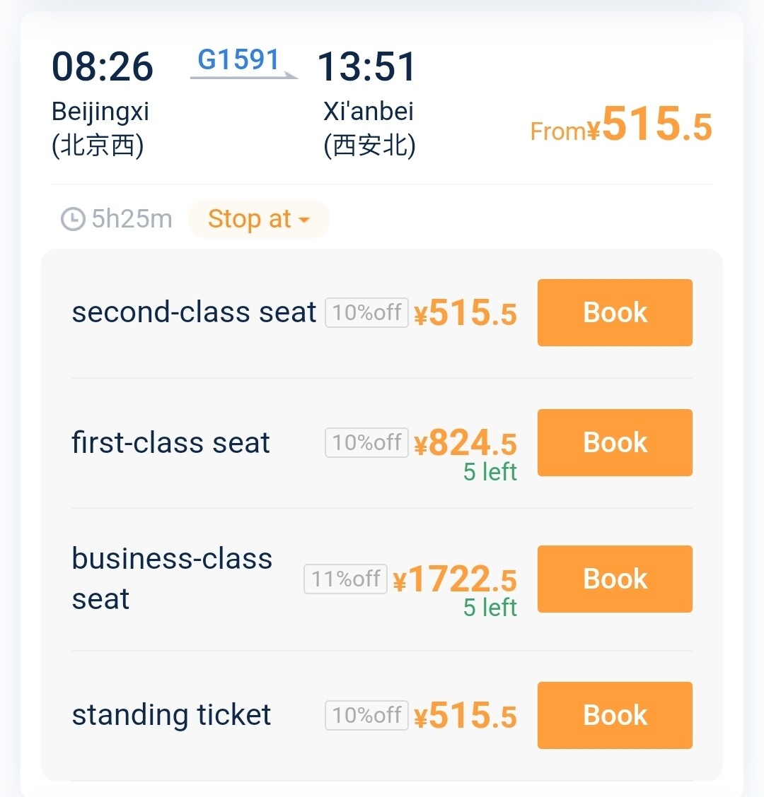 Funktioniert fast genauso einfach wie bei trip.com ist aber billiger, durch den Wegfall der Buchungsgebühr. App ist komplett auf englisch. Außerdem gibt es wie so oft in China bei kurzfristiger Buchung Rabatt, z. B. für morgen 10% auf der Beispielroute. Bezahlung ist allerdings in CNY, nicht in EUR wie bei trip, Gebührenfreie Kreditkarte also von Vorteil.