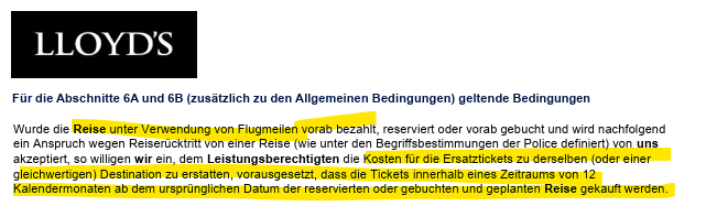 Naja, konkret hieß es die Versicherung würde dann innerhalb eines Jahres ein Cash Ticket für exakt das Meilenticket (Route, Klasse) bezahlen. Wobei mir nicht klar ist ob das Jahr mit dem ursprünglichen Buchungstage oder dem Flugtag oder dem Stornierungstag beginnt. Ersteres wäre natürlich bei der langen Vorausbuchungsfrist von Award Tickets nicht so schön.