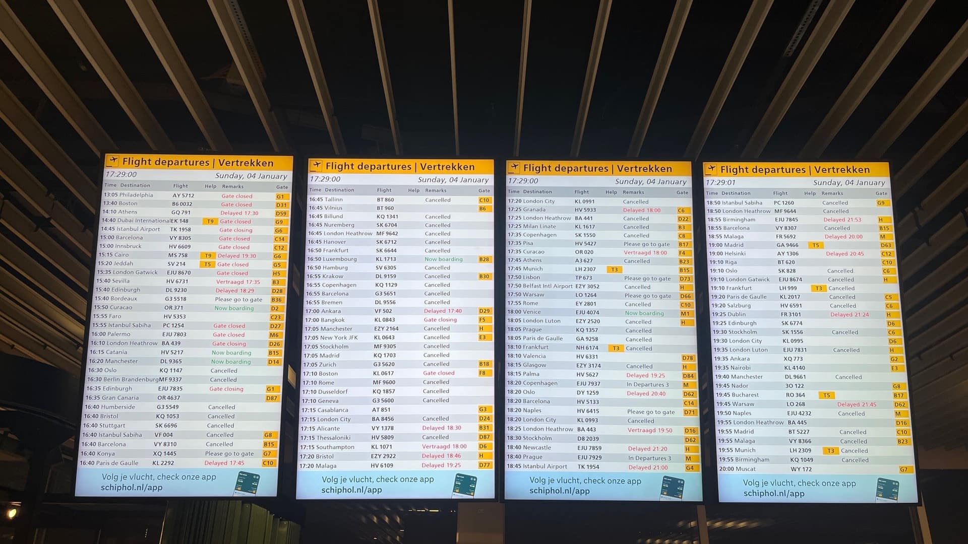 Flüge werden auch noch bis kurz vor Boardingbegin annuliert. Auch egal von welchem Flughafen aus Du in AMS ankommst.