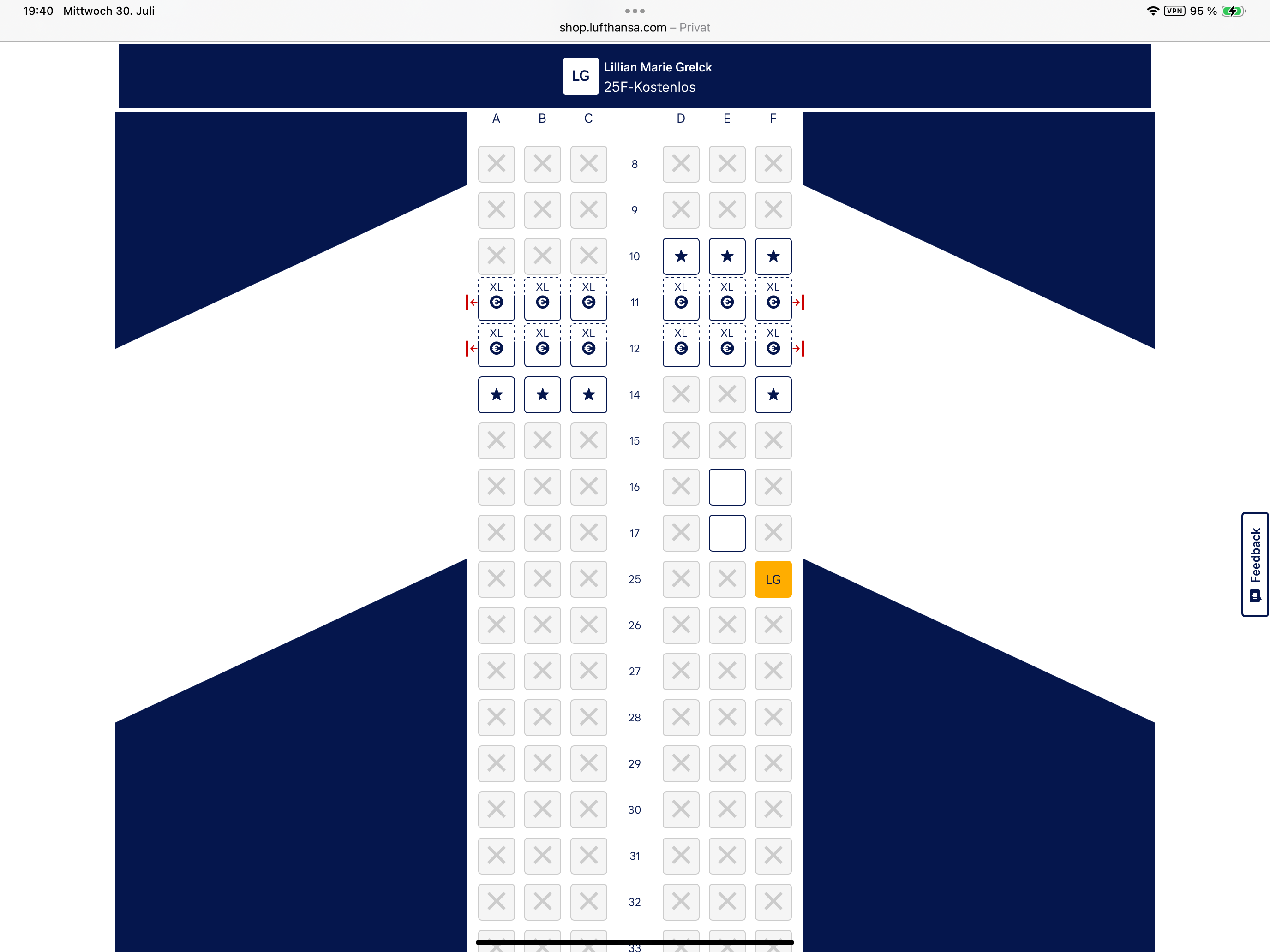 Ich habe gerade die Info bekommen, dass aufgrund einer Änderung ich jetzt einen neuen Sitzplatz - 17C - habe (?). Egal. Die eigentliche Frage ist: wie kann es sein, dass über meinen LH Account (Bild 1) ganz andere Platzverfügbarkeiten angezeigt werden, als bei der Tochter (Bild2).