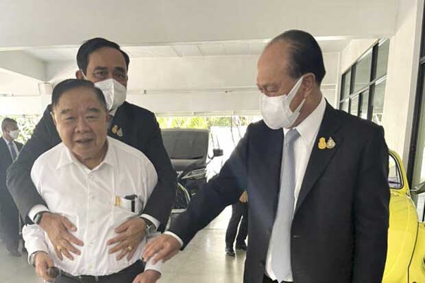 der zwist zwischen führer und dem parteichef Pravit schwelt weiter. gestern nun lunch um einigkeit zu zeigen, sieht das foto sehr einig aus oder wird Pravit am weglaufen gehindert? finde es anyhow lustig