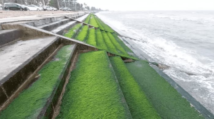 - kein maler könnte es schöner: jedes jahr um diese zeit verfärben sich in Pranburi bei Hua Hin die stufen zum strand auf ca 2 kim grün, dank millionen algen die die stufen überziehen und auch noch essbar sind.