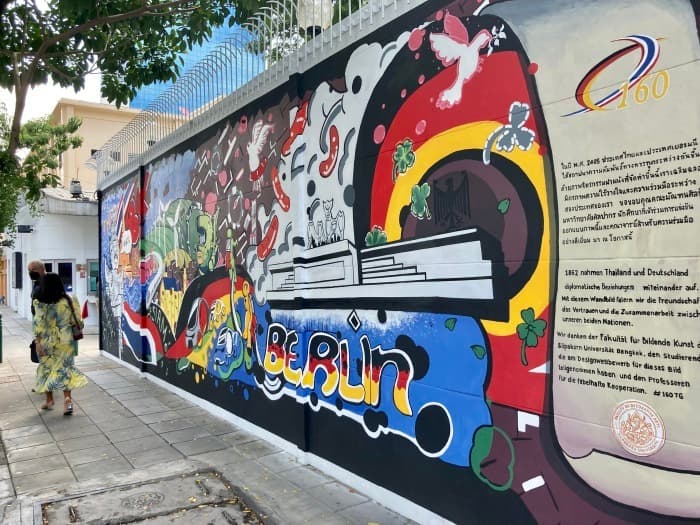 - vor 160 jahren begannen die diplomatischen beziehungen D-Th. zum jubiläum durften kunststudenten die aussenwand der botschaft verzieren, an vielbefahrener strasse. top werbung für lau