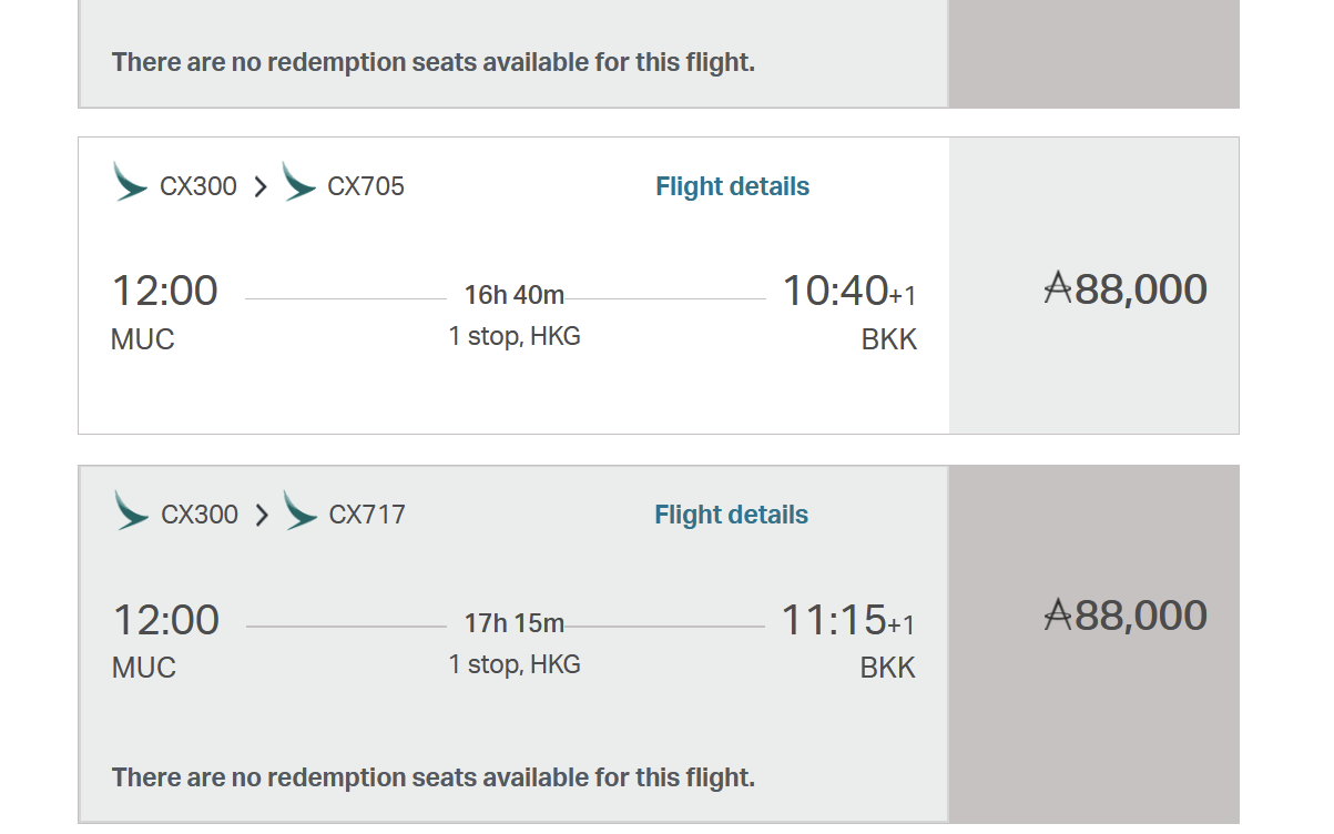 Ab und zu findet sich aber schon etwas. Zum Beispiel Business Class MUC - BKK für 88.000 Meilen + Zuzahlung (dürften ~300€ sein) pro Richtung: