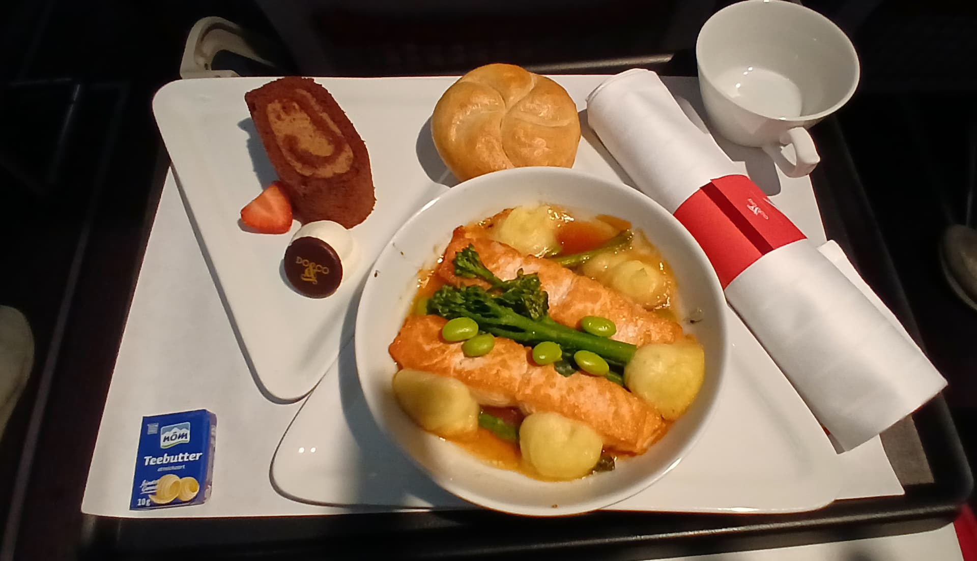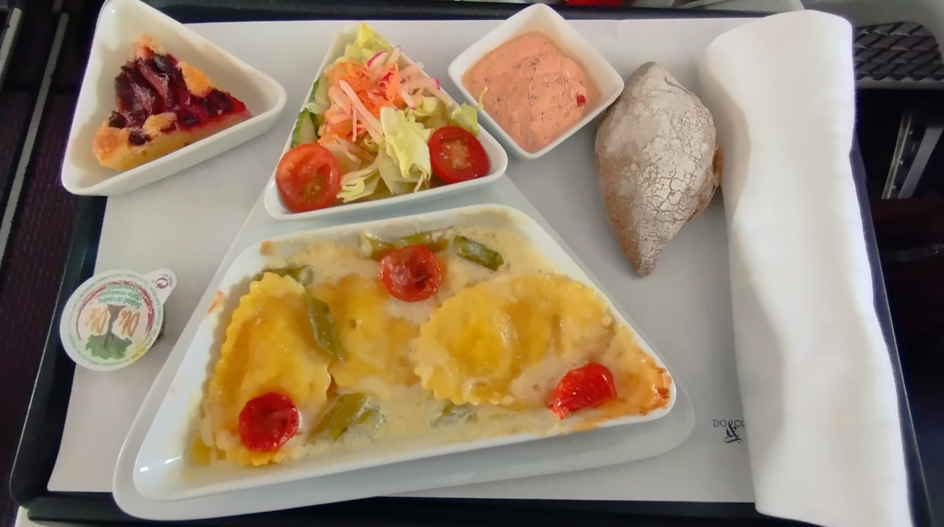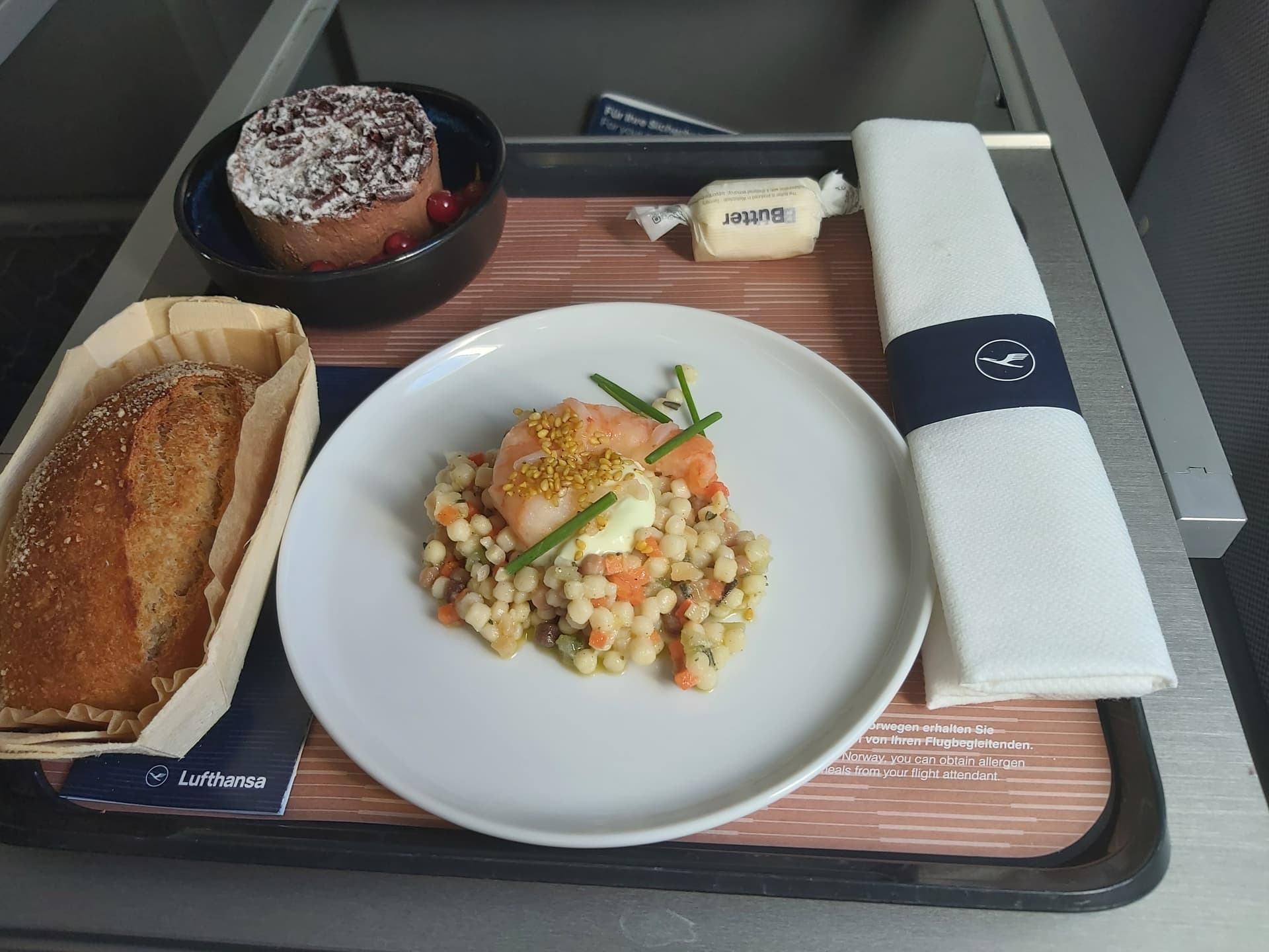 Freut mich, wenn es mundet. Für die Dauer des Fluges sieht es wirklich gut aus, wenngleich man quasi den LH-Controller neben dem Caterer vor Augen hat, dass das Gesamtpaket nicht mehr als 2,99€ Zutaten kosten darf.