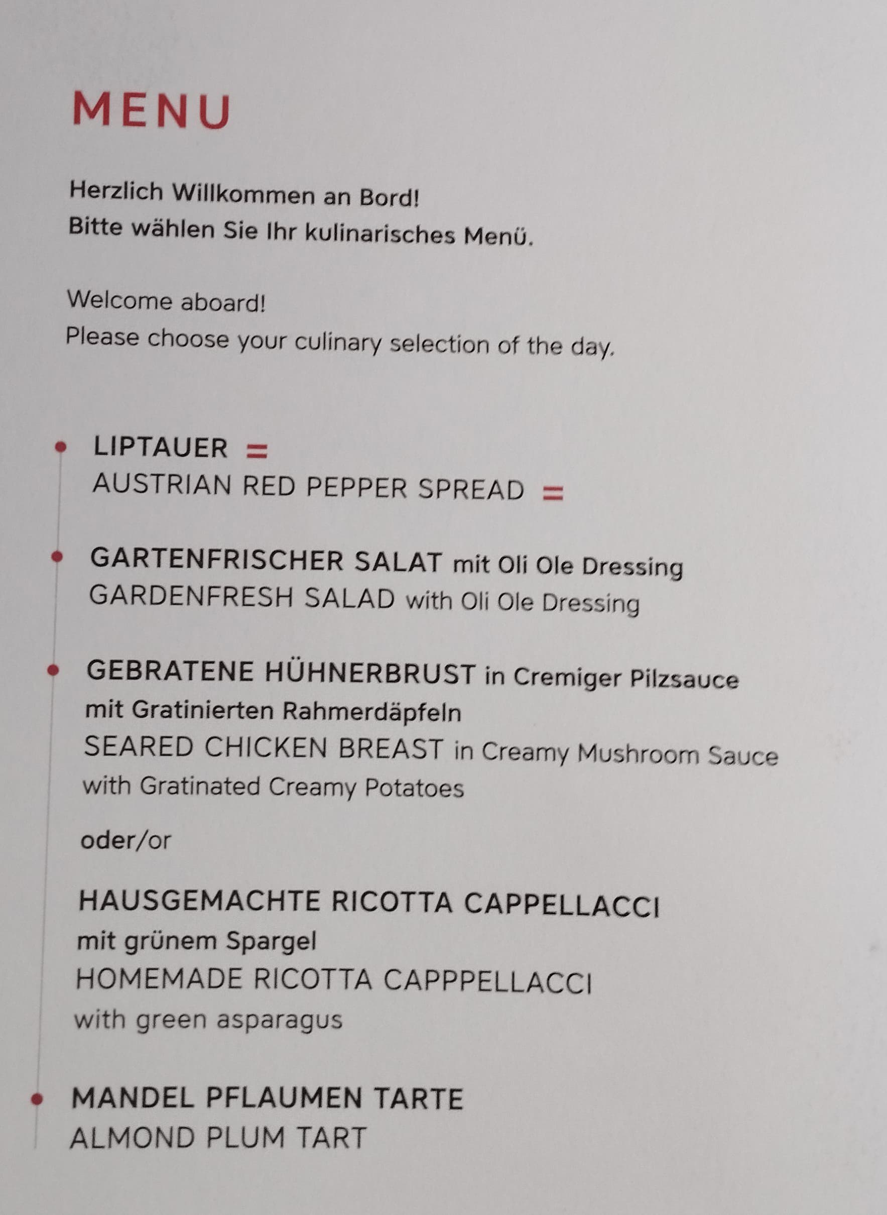 Essen schaut wie so oft bei OS gut aus. Nur „gartenfrischer Salat“ (O-Ton Speisekarte) für die Inhalte aus einem Plastik-Beutel-Salat aus dem Kühlregal ist wieder so herrliches Marketing-Sprech, welches mit der Realität nichts zu tun hat… ![]()