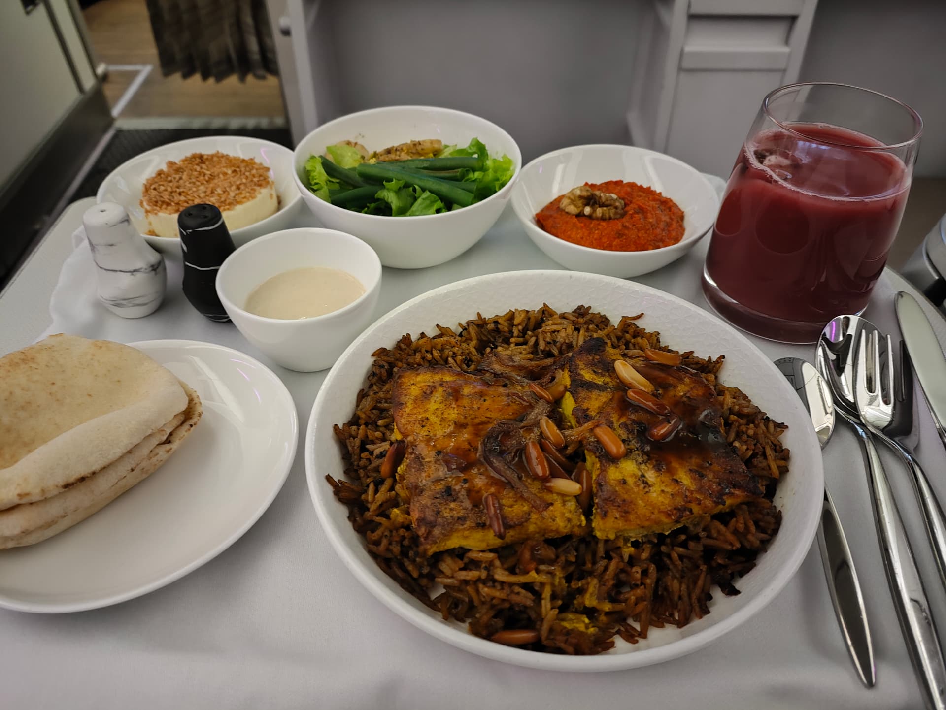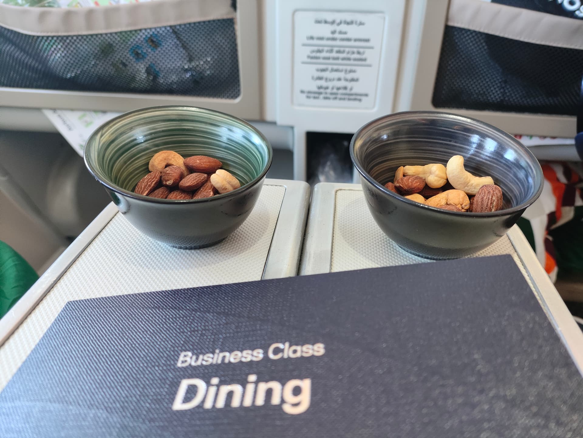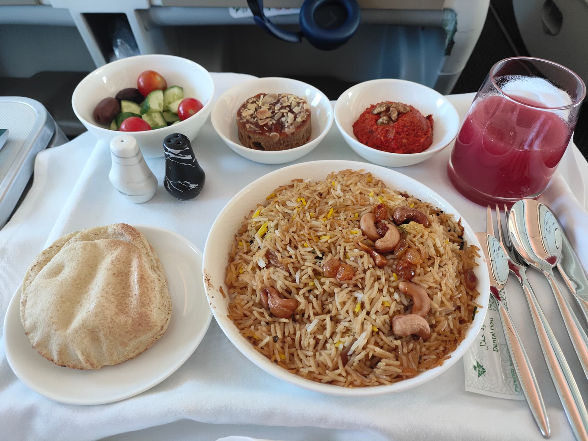 Pre-Departure Programm identisch, jedoch diesmal nur eine Runde arabischer Kaffee mit Dattel. Service diesmal durchwachsen.