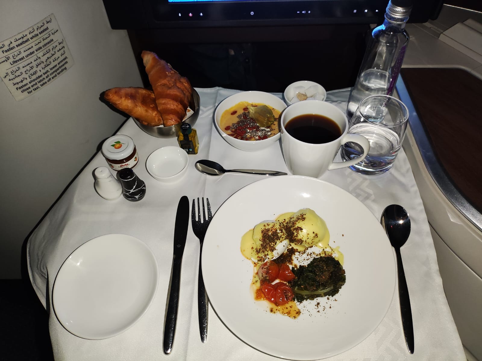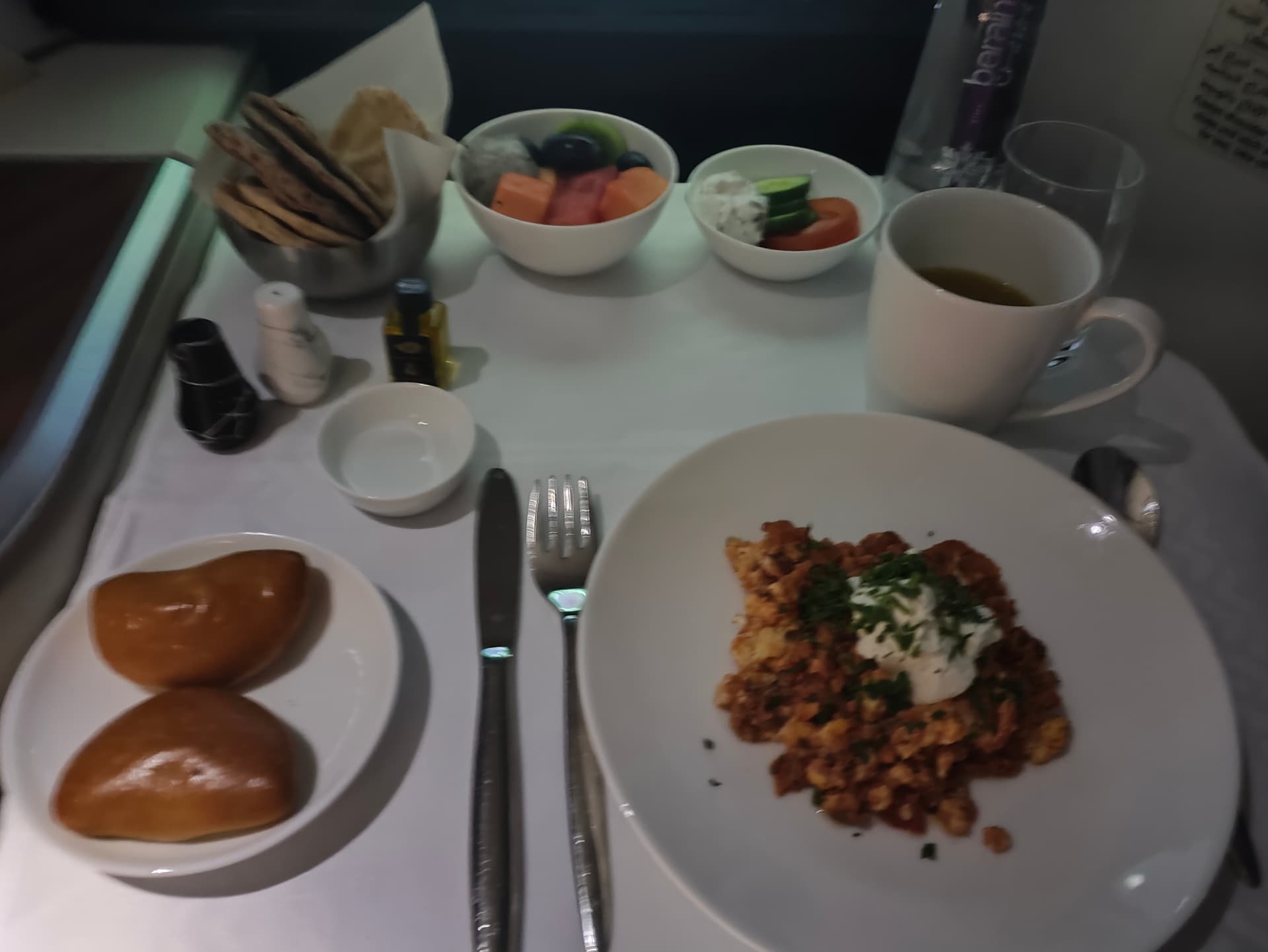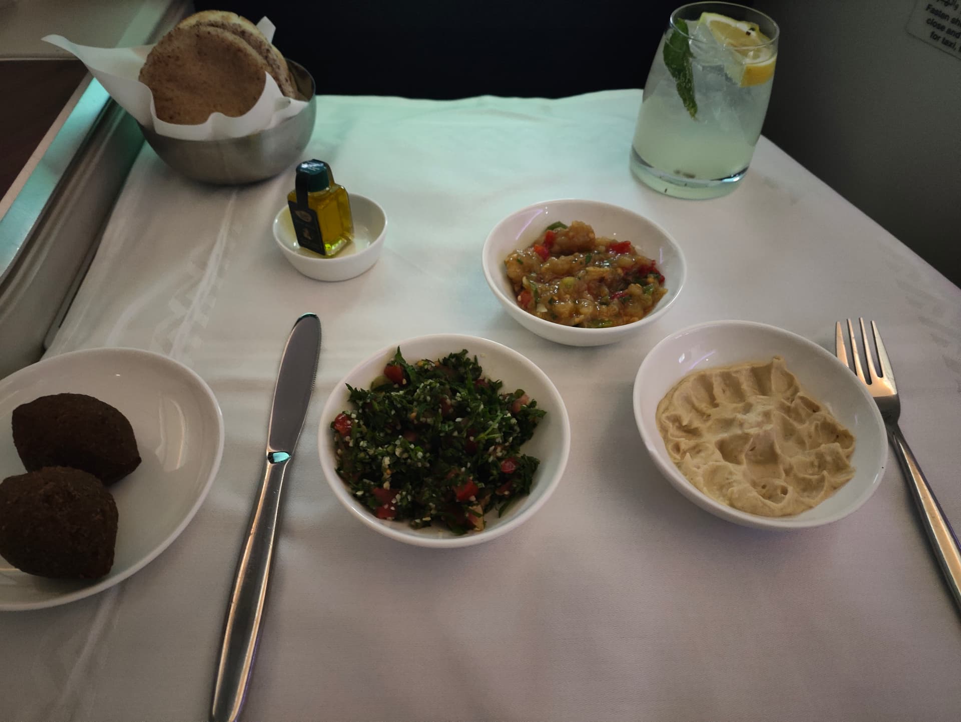 Pre-Departure Programm identisch, jedoch diesmal nur eine Runde arabischer Kaffee mit Dattel. Service diesmal durchwachsen.
