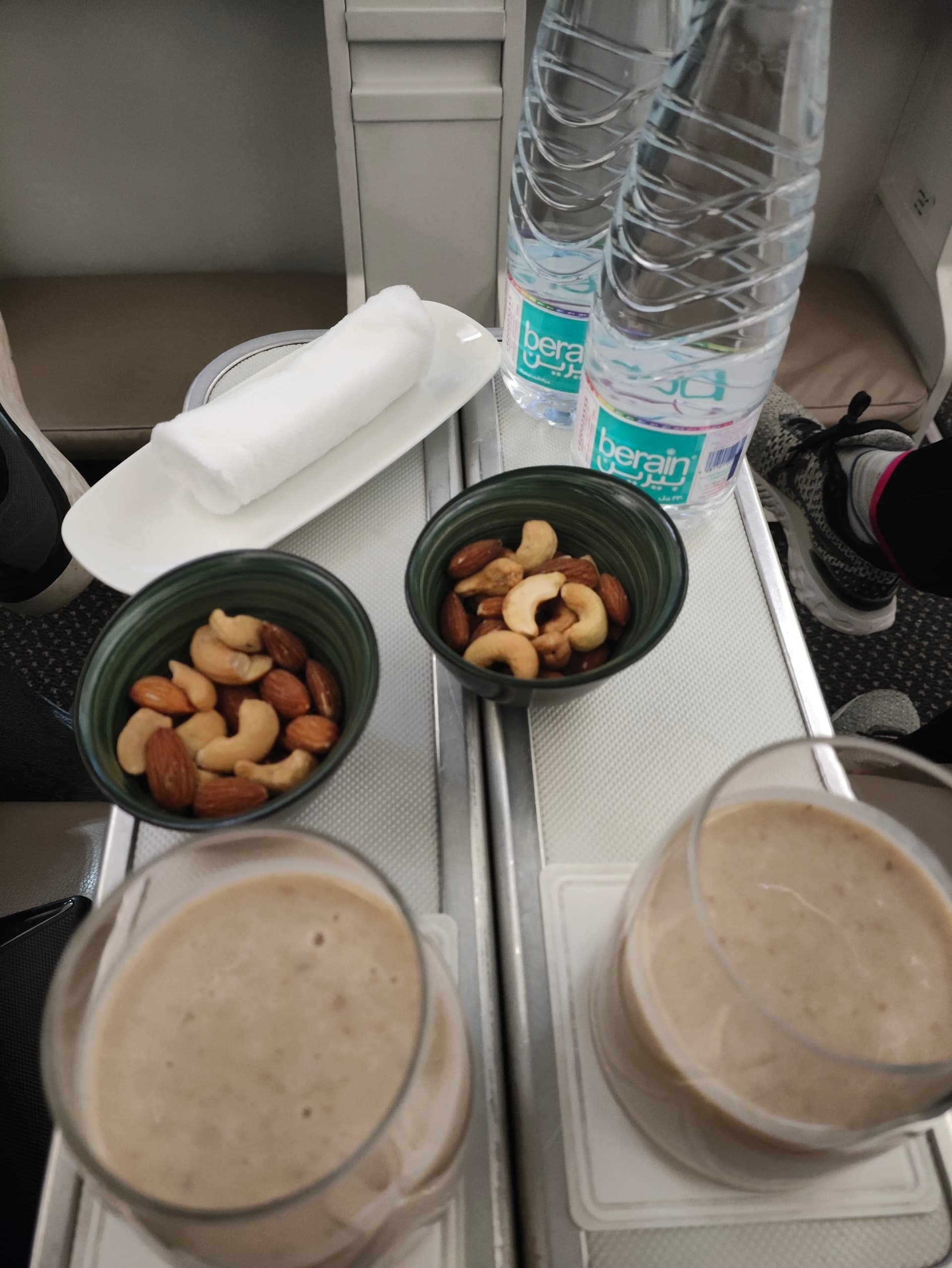 Vor dem Start bereits Erfrischungstuch, Willkommensdrink (wir haben uns hier und auch fortan immer für einen sehr leckeren Dattel-Bananen-Smoothie entschieden) und warme Nüsse sowie mehrere runden arabischer Kaffee mit Dattel erhalten. Wasser bereits am Platz.