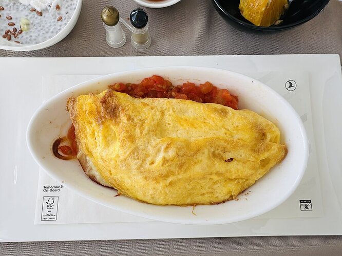 Die Vorspeise, Caprese Burrata wurde zusammen mit dem Dessert, einer Sacher-Schnitte, wird hier zusammen mit dem Hauptgericht serviert. Wir hatten beide ein Essen vorbestellt. Für mich war das Gemüse-Quiche. Ob das hier eine ist, dürft ihr selbst bewerten. Aber das Rührei war sehr lecker ![]()