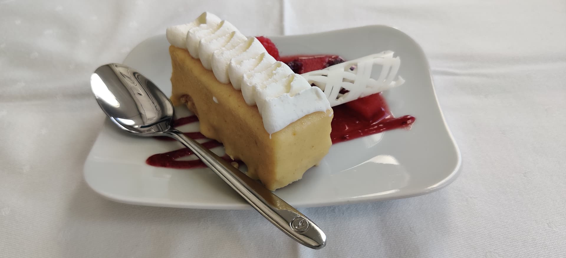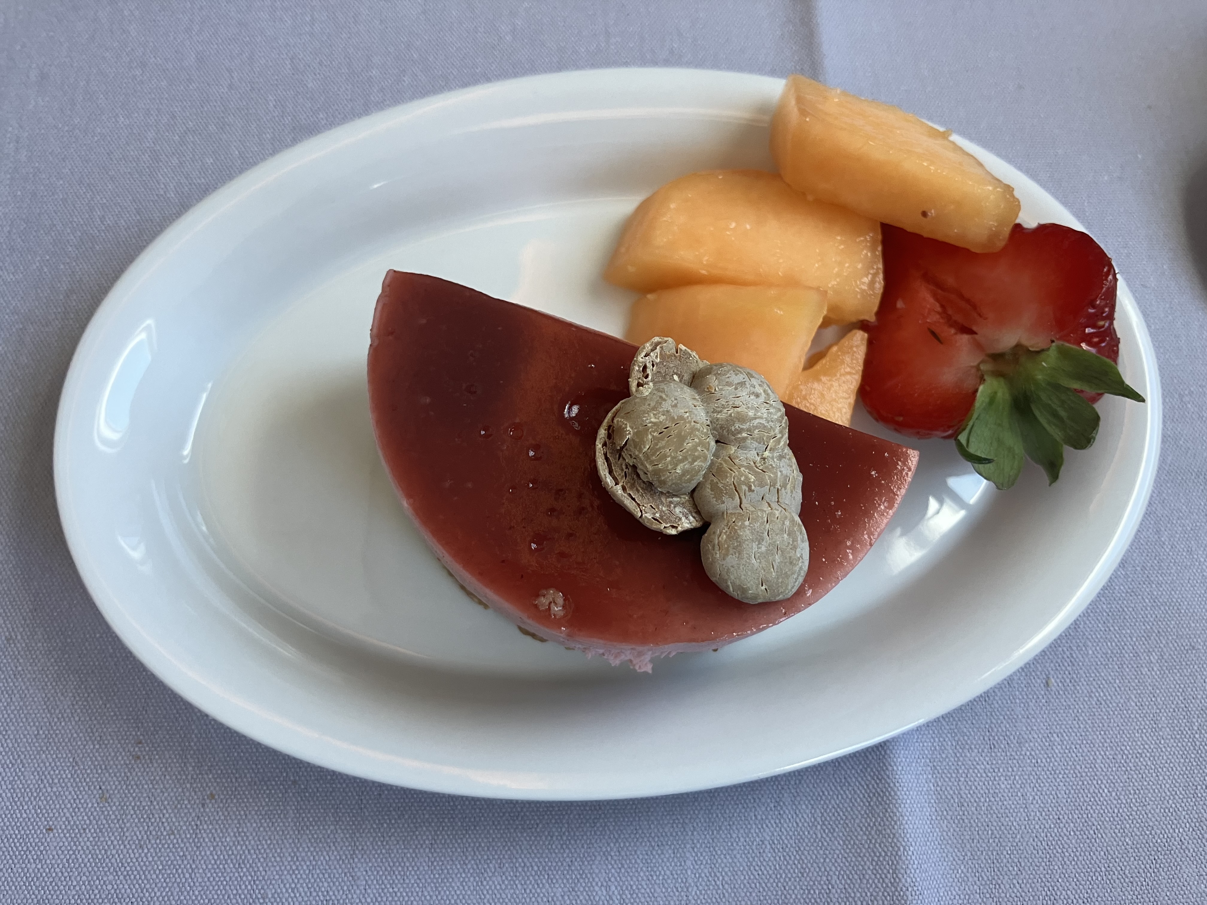 Vorspeise: eine Art Frischkäse (exzellent!), Tortelloni (zwar verkocht, aber mit Fleischfüllung und lecker), Obstteller (frisch!) und dem Dessert mit der Pistazienmousse auf Streusel-Grablegung (entgegen meiner Erwartung auch SEHR gut).