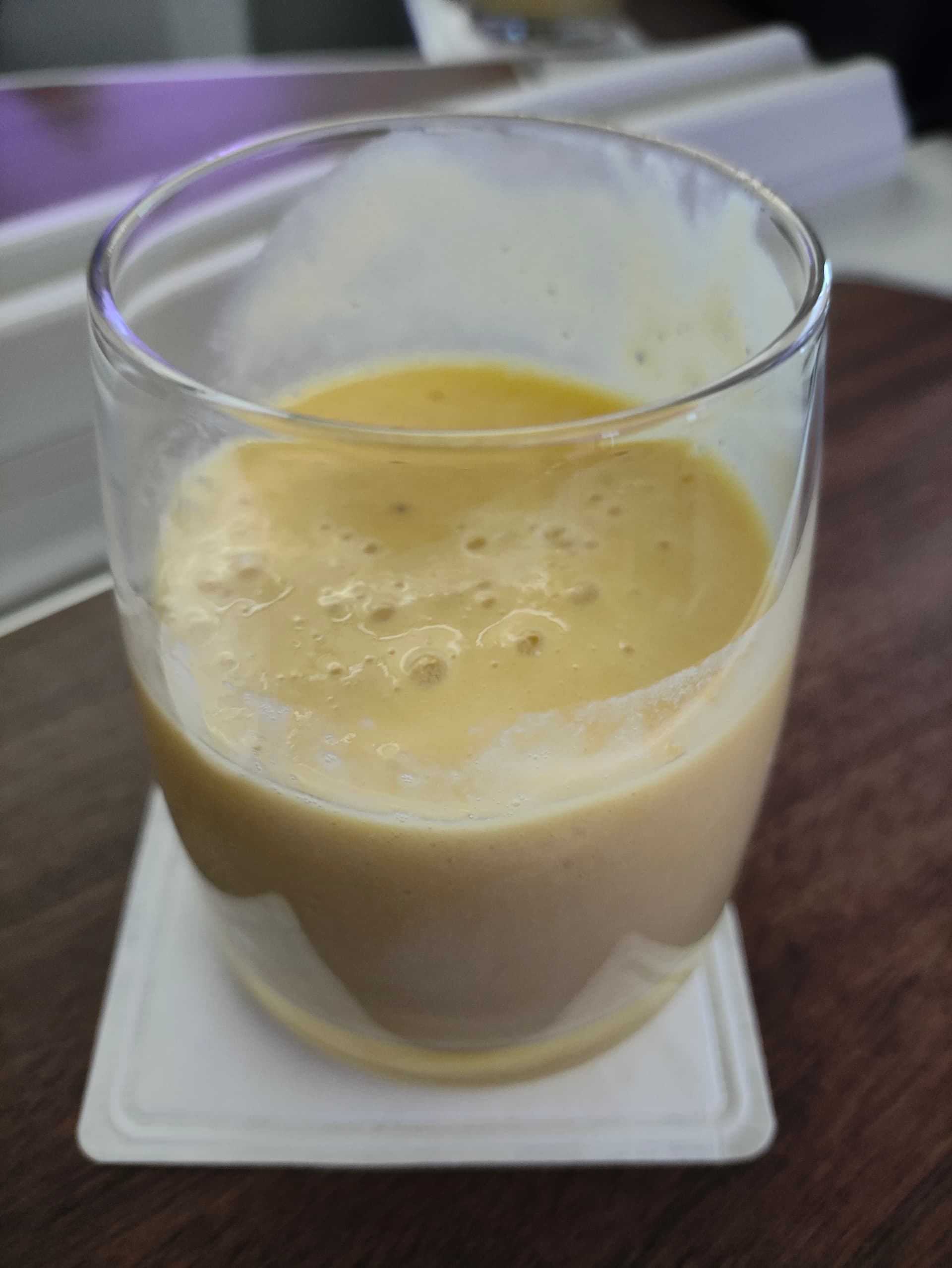 Mango Smoothie. Optisch nicht so der Hingucker, aber trotzdem lecker. Kommt aber bei weitem nicht an den Dattel Smoothe ran.
