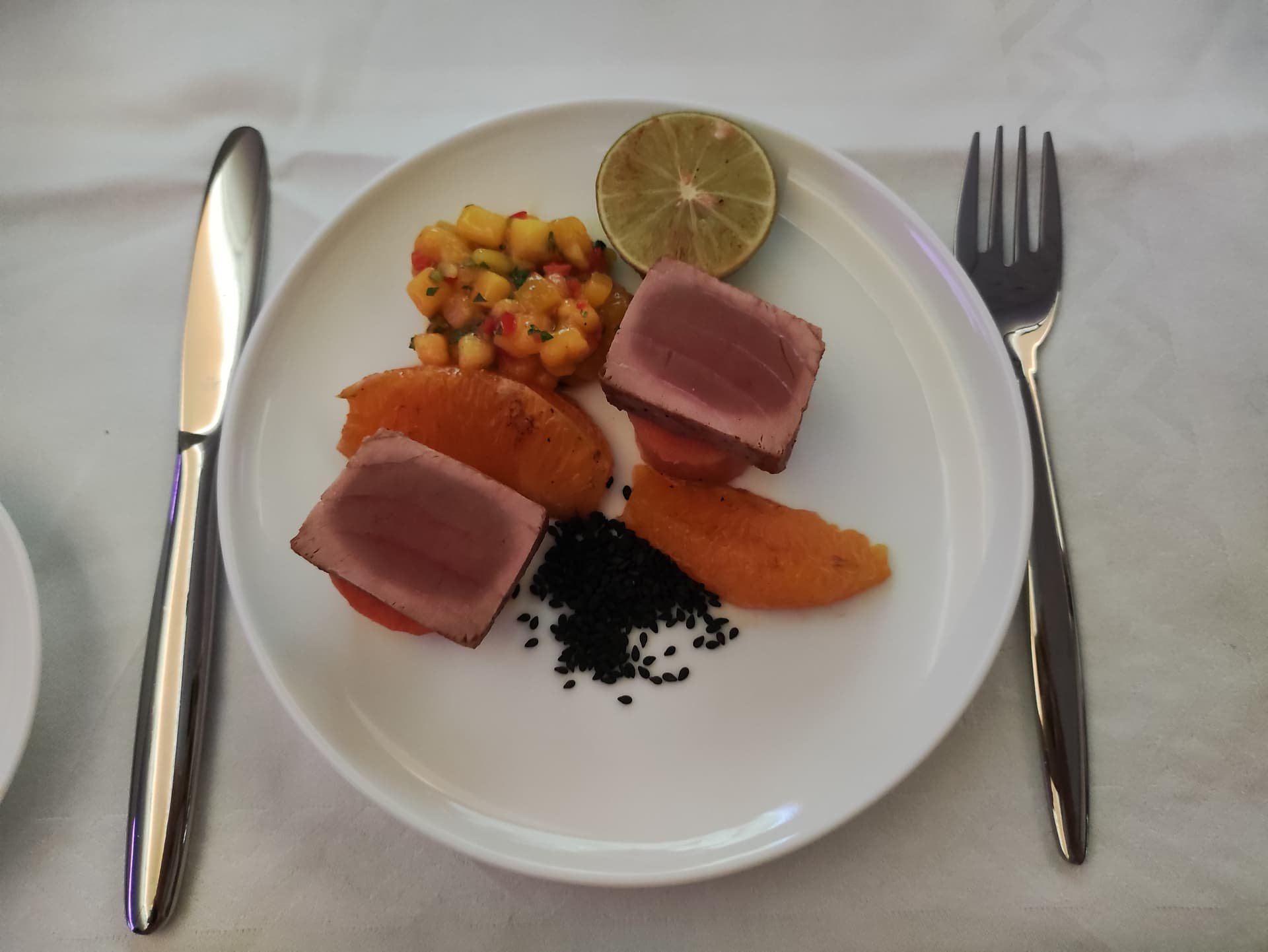 Alternative (von +1) - Starter: Pan-seared tuna loin w/ grilled orange segments, sweet potato and mango salsa