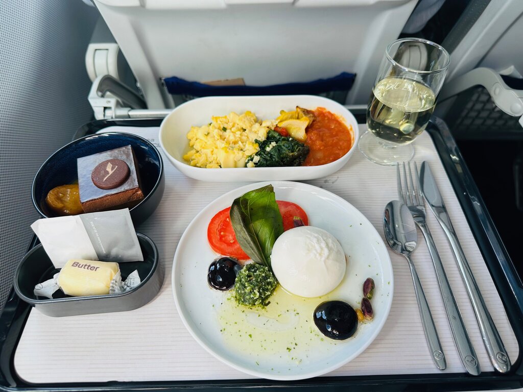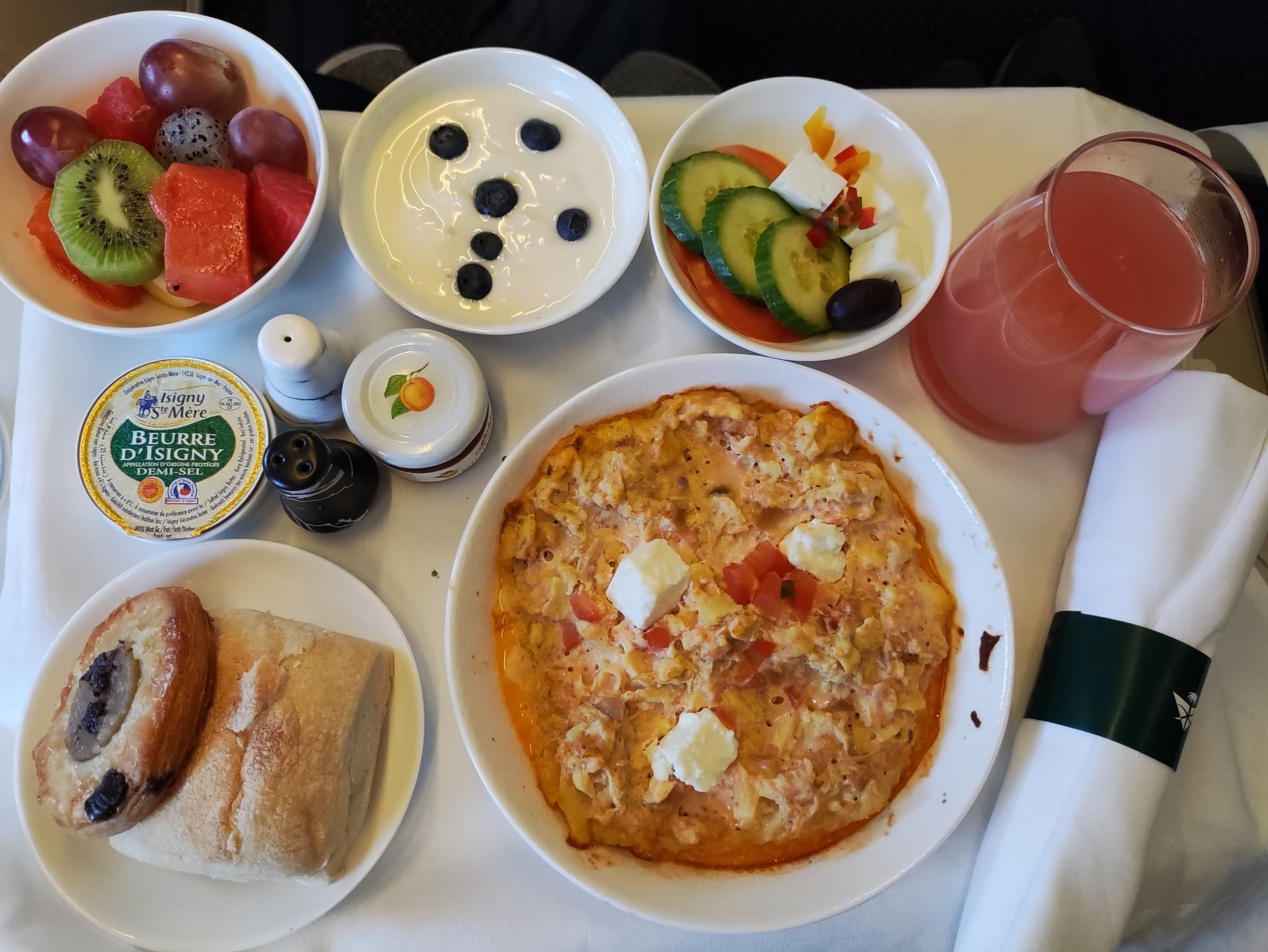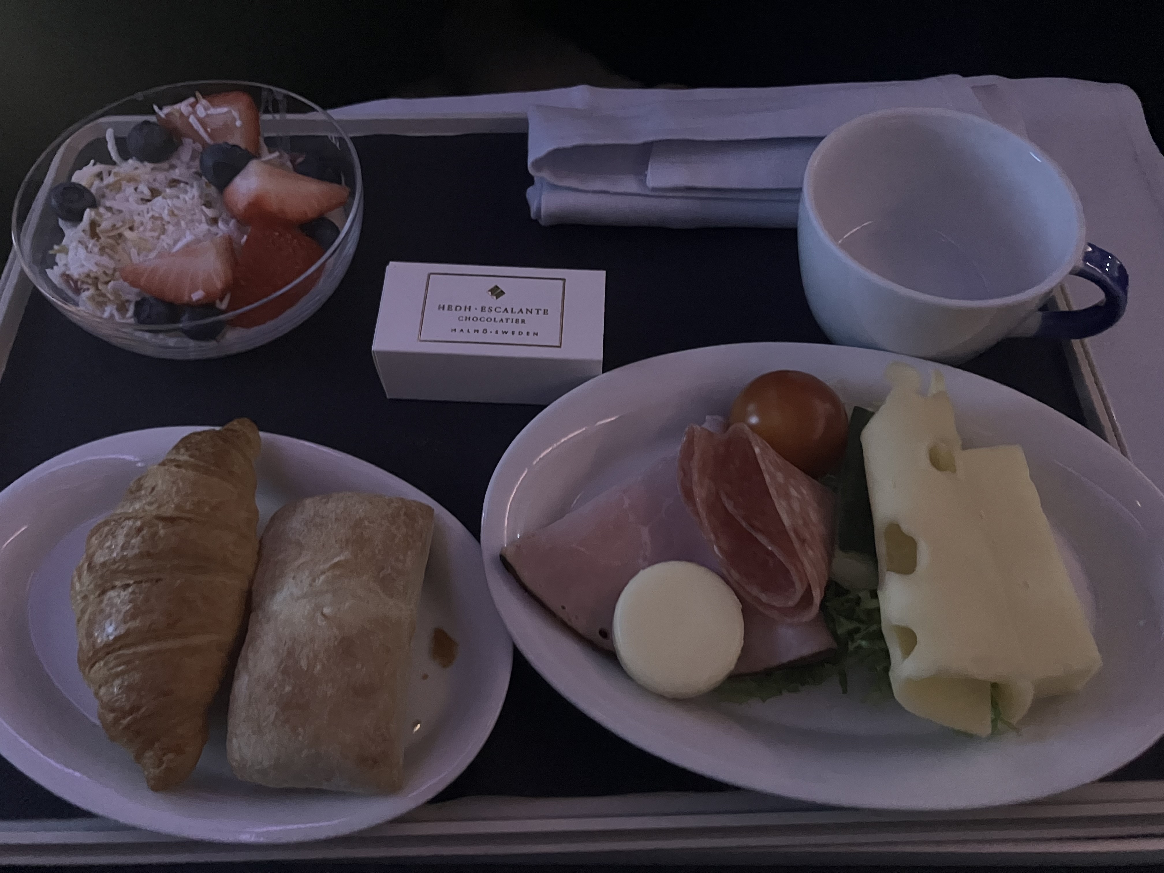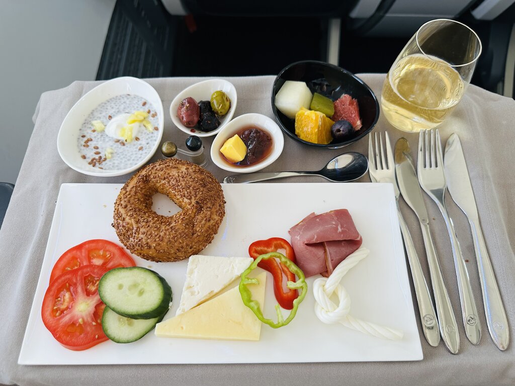 Im Flug wurde zuerst die Vorspeise unseres Frühstücks serviert. Chia-Joghurt, Früchte, Oliven, Marmelade sowie eine Auswahl an Aufschnitt.