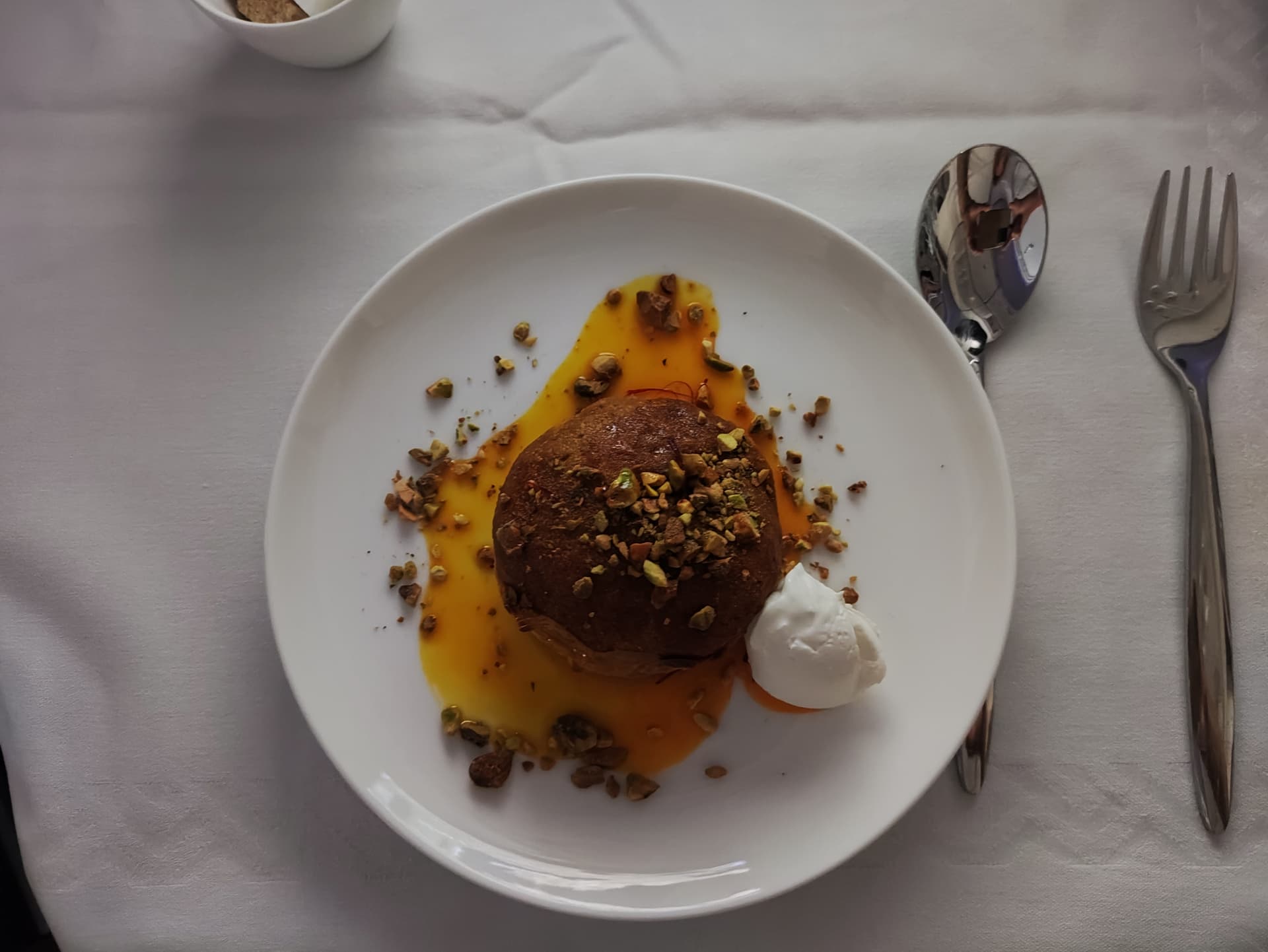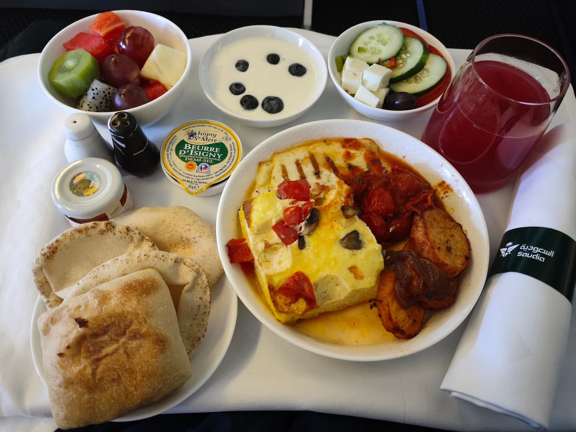 Hier gabs, weil wir ganz hinten saßen, das Saudi Suffrah nur noch einmal, sonst hätten wir es beide genommen. War aber beides sehr lecker. Auch im ersten Flug schon (ebenfalls ganz hinten), musste erst geprüft werden, ob es unsere Wahl überhaupt noch gäbe.
