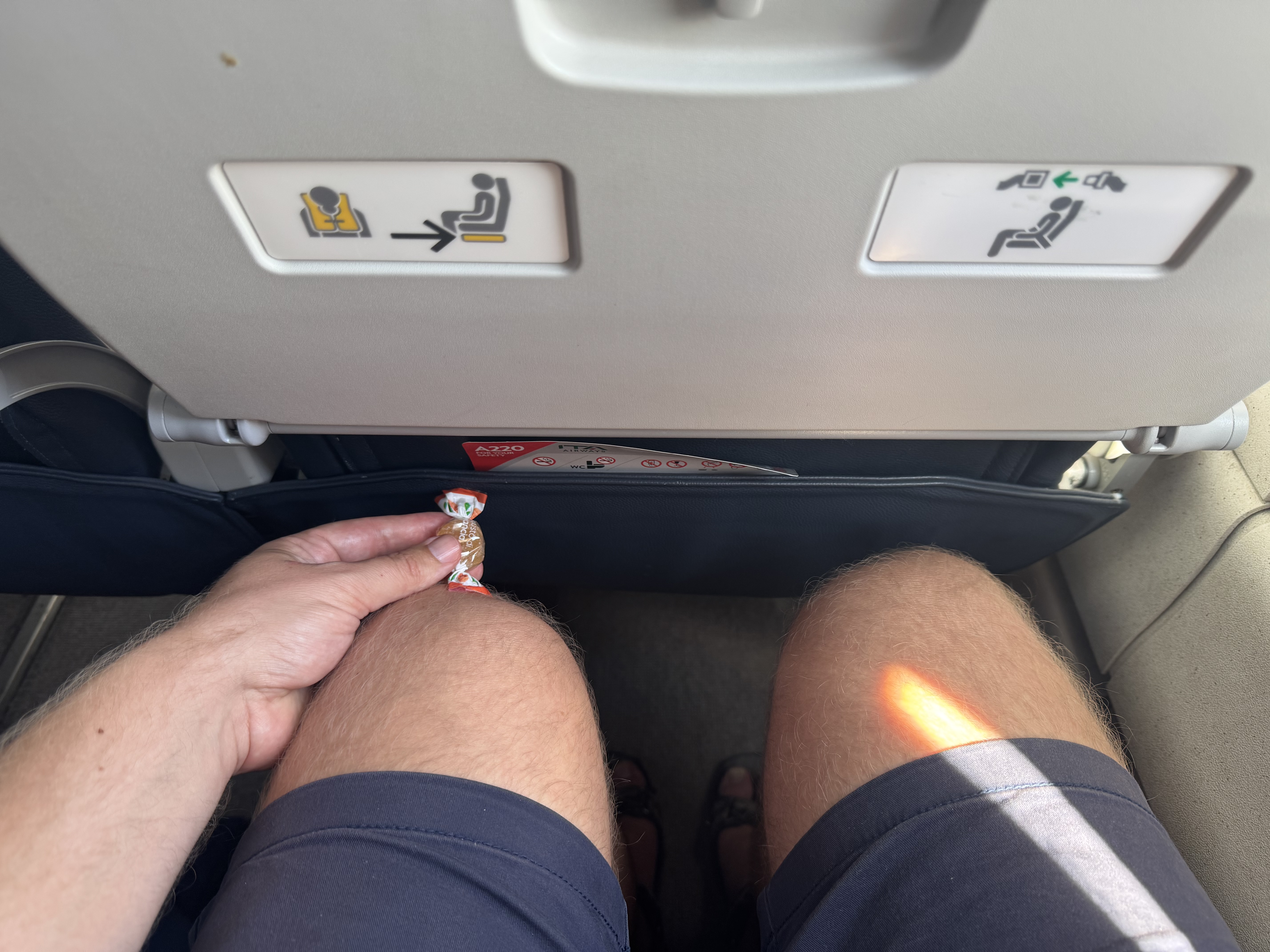 Leider vergessen ein Foto zu machen. Es gab einen Corny Riegel, einen Apfel und einen Softdrink pro Person und der Sitzabstand war tatsächlich etwas größer als in der Eco. In diesem Fall sogar ein kostenloses “Upgrade” gewesen, welches aber keineswegs kommuniziert wurde (habe es erst durch Blick auf die Bordkarte zufällig entdeckt).