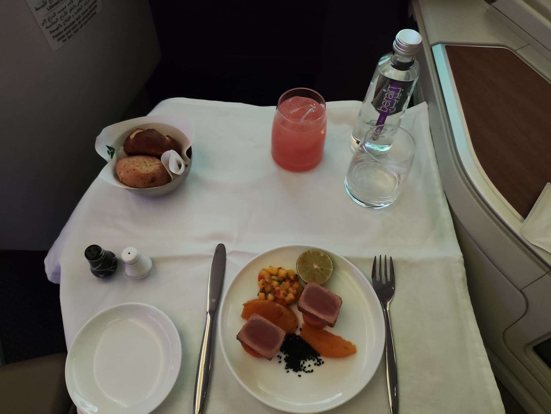 Nach dem Essen war aber nicht mehr viel geboten, vom Service nix mehr zu sehen - und auf beiden Flügen habe ich irgendwie auch keine zweite Essenrunde (das Light Dining „Arabic Mezze“) bekommen (keine Ahnung, ob das irgendwie ein Missverständnis war), und auch keine Snacks. +1 hat auf einem der beiden Flüge zumindest Snacks angeboten bekommen. Im Endeffekt wurden in der Luft auch nur 2 Getränke serviert, und eines, das ich bestellt hatte, kam leider nie. Ich bin trotzdem die Fraktion „Call Button vermeiden“, ich will nicht nerven. Aber andererseits will ich auch ungern ignoriert werden.