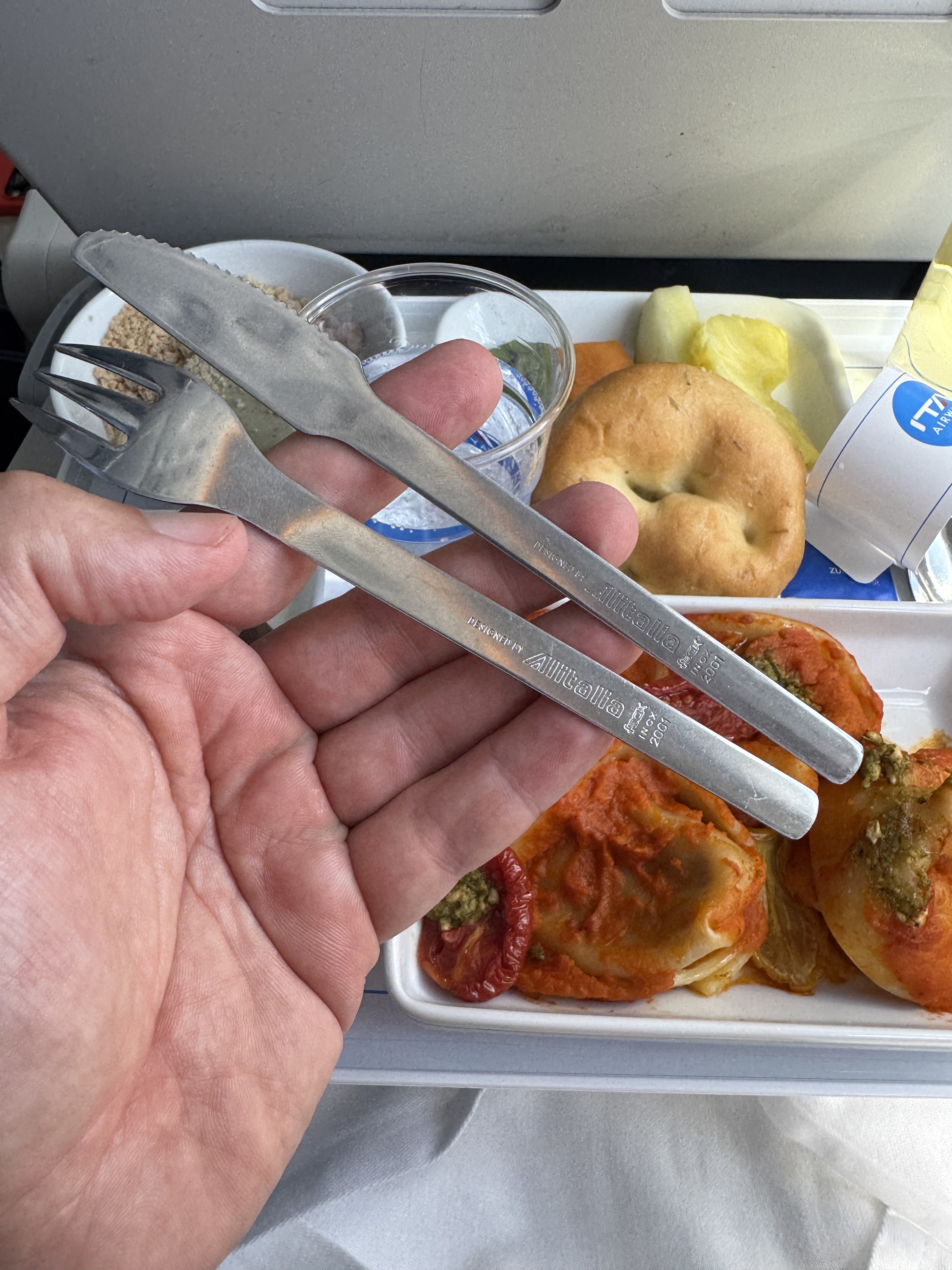 PS: Kaffee wurde bei ITA natürlich auch serviert, aber von mir nicht konsumiert. Und das Besteck erklärt, dass die Design-Abteilung der Alitalia eventuell Mit-Ursache ihres Untergangs war. Das Geld für den eigenen Coporate Look war jedenfalls nicht gut investiert.