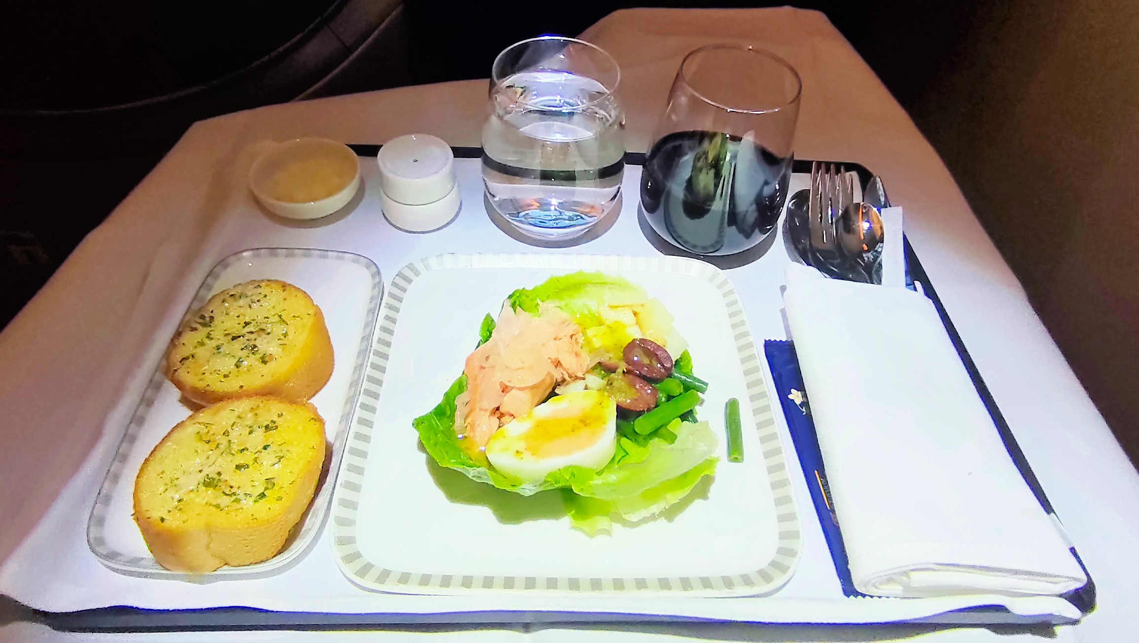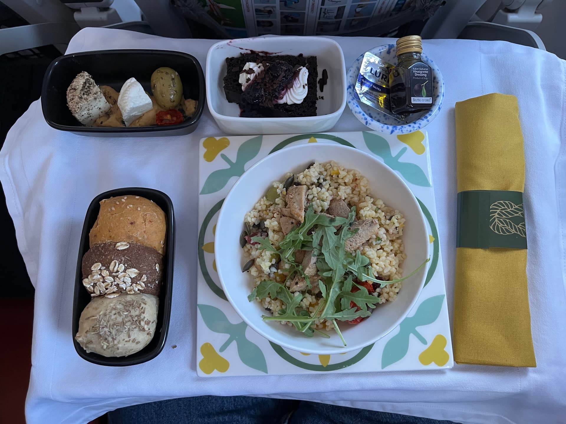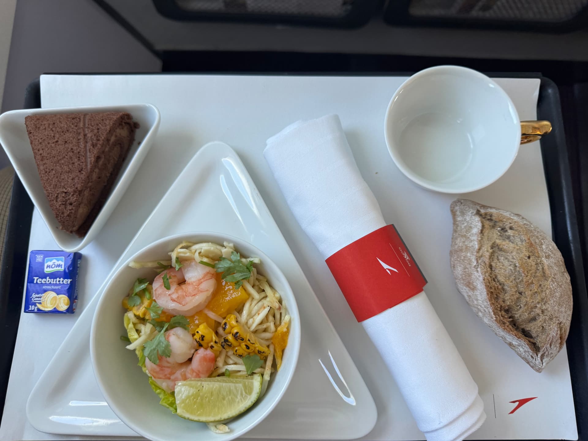 Der Cremekuchen war verblüffend simpel doch geschmacklich gut. Hauptgang: Lecker angemachter Salat mit zwei Shrimps. Nicht viel aber für den 65 Minuten Hüpfer okay.